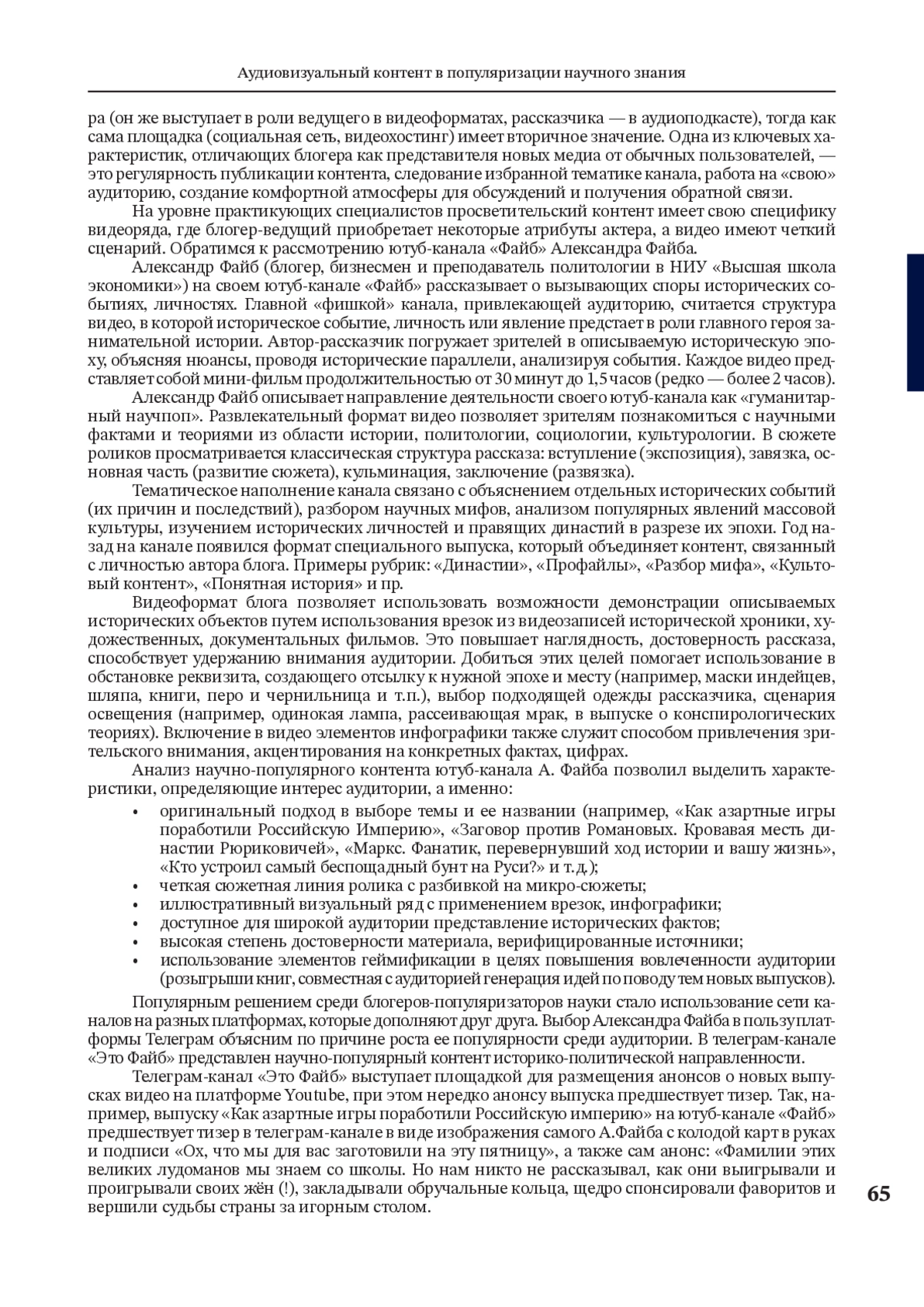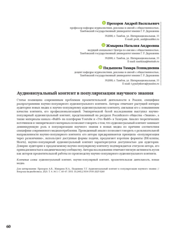 Статья посвящена современным проблемам просветительской деятельности в России, специфике распространения научно-популярного аудиовизуального контента. Авторы отмечают растущий интерес аудитории новых медиа к научно-популярному аудиовизуальному контенту, связывая его с повышением качества контента, его профессионализацией. Эмпирической базой исследования выступил научнопопулярный аудиовизуальный контент, представленный на ресурсах Российского общества «Знание», а также материалы канала «Файб» на платформе Youtube и «Это Файб» в Телеграм. Анализ теоретических источников и эмпирического материала позволяет говорить о том, что аудиовизуальный контент занимает доминирующую роль в популяризации научного знания в новых медиа по причине соответствия специфике современного медиапотребления. Проведенный анализ позволяет говорить о развлекательной направленности научно-популярного контента: его авторы придерживаются принципа «популяризация через развлечение», используют доступные формы подачи, предлагают короткие форматы (ВК-клипы, Shorts), научно-популярный аудиовизуальный контент характеризуется доступностью для аудитории. Доверие аудитории к предлагаемому научно-популярному контенту подтверждается статусом автора, его принадлежностью к академическому сообществу. Авторы исследования отмечают низкую активность вузов как акторов просветительской работы по производству научно-популярного аудиовизуального контента.