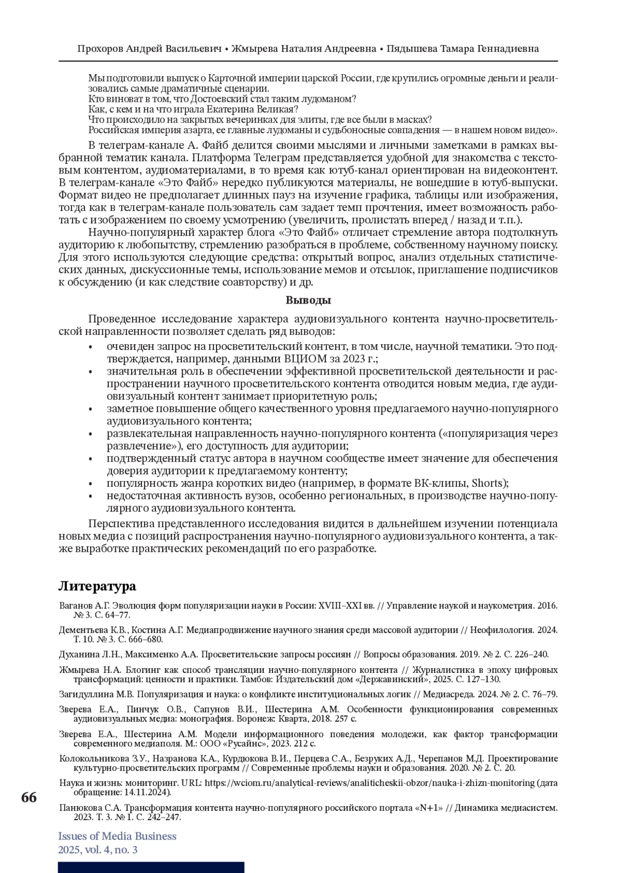 5. Загидуллина М.В. Популяризация и наука: о конфликте институциональных логик // Медиасреда. 2024. № 2. С. 76-79.