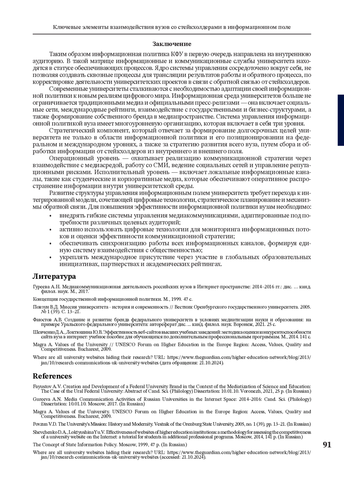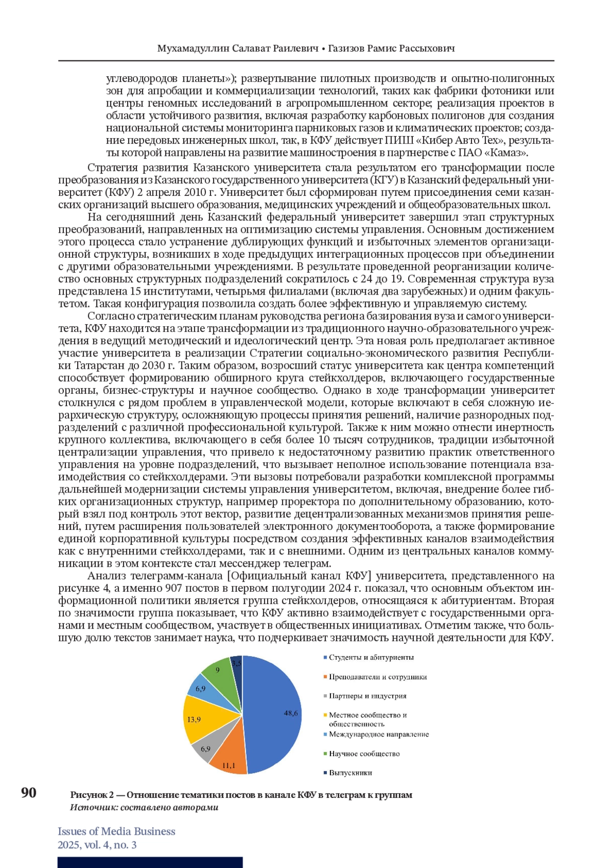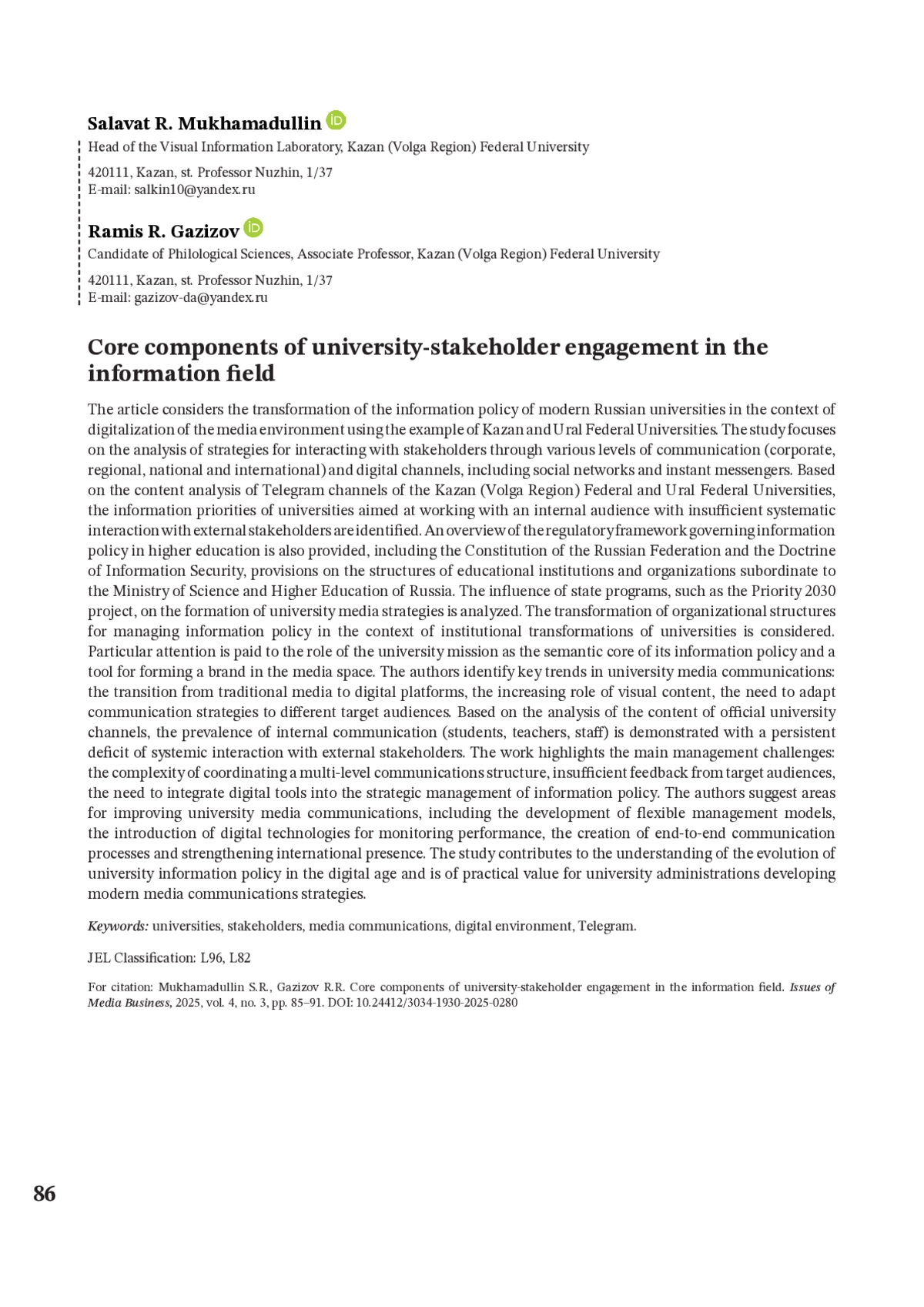 МУХАМАДУЛЛИН С. Р., ГАЗИЗОВ Р. Р. КЛЮЧЕВЫЕ ЭЛЕМЕНТЫ ВЗАИМОДЕЙСТВИЯ ВУЗОВ СО СТЕЙКХОЛДЕРАМИ В ИНФОРМАЦИОННОМ ПОЛЕ // ВОПРОСЫ МЕДИАБИЗНЕСА. 2025. № 3, ТОМ 4