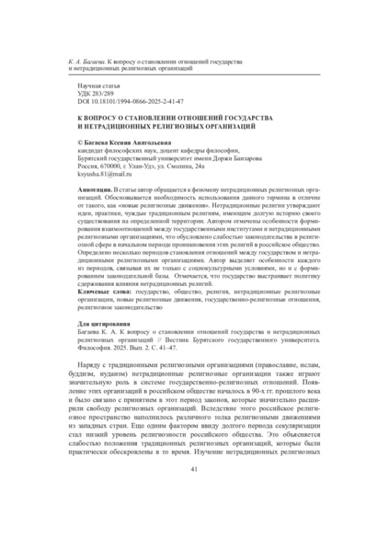 3. Багаева К. А. К вопросу о нетрадиционных религиозных организациях в России // Евразийство и мир. 2019. № 2. С. 80-84. Текст: непосредственный. EDN: JOERGY