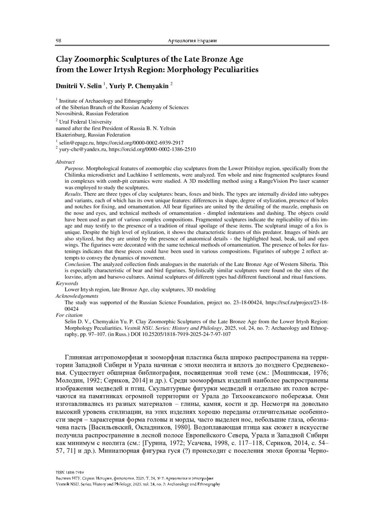 Выполнен анализ морфологических особенностей образцов зооморфной глиняной пластики с территории Нижнего Прииртышья, с поселений Чилимского микрорайона и Лучкино I, с применением 3D-моделирования. Всего было изучено десять целых и девять фрагментированных скульптур, обнаруженных в комплексах с гребенчато-ямочной керамикой. Выделено три типа: изображения медведей, лисицы и птиц. Типы разделяются на подтипы и варианты, для каждого из которых характерны свои особенности морфологии и орнаментации. Все фигурки медведей объединяет детализация морды, акцент на нос и глаза, приемы нанесения узоров. Уникально стилизованное изображение лисицы, на нем обозначены характерные черты этого хищника: узкая вытянутая морда, заостренные уши, длинный объемный хвост. Фигурки птиц также стилизованы, их объединяет наличие анатомических деталей. Скульптуры подтипа 2 отражают попытки передачи динамики движения. Проанализированная коллекция находит аналогии в материалах эпохи поздней бронзы Западной Сибири в лозьвинской, атлымской, барсовской культурах.
