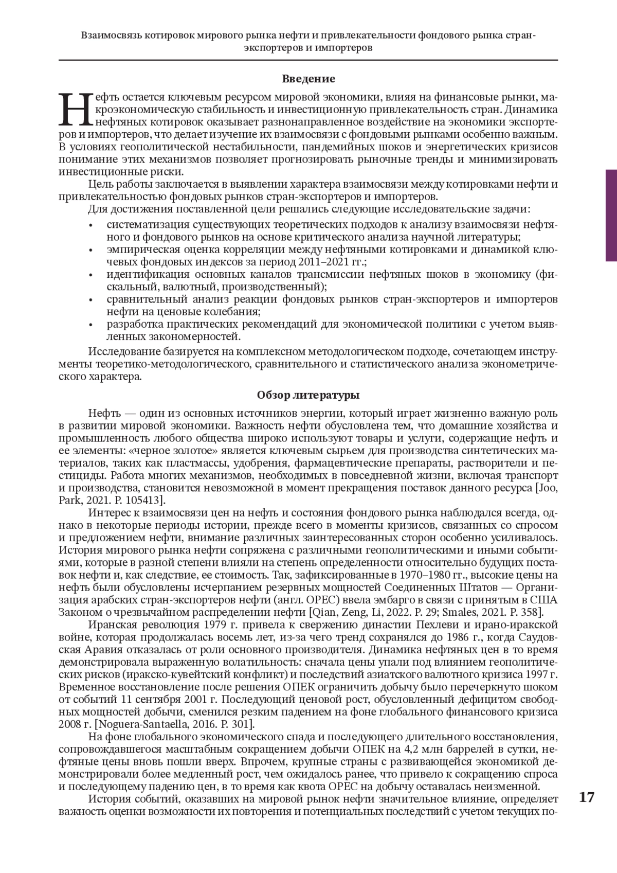 Нефть остается ключевым ресурсом мировой экономики, влияя на финансовые рынки, макроэкономическую стабильность и инвестиционную привлекательность стран. Динамика нефтяных котировок оказывает разнонаправленное воздействие на экономики экспортеров и импортеров, что делает изучение их взаимосвязи с фондовыми рынками особенно важным. В условиях геополитической нестабильности, пандемийных шоков и энергетических кризисов понимание этих механизмов позволяет прогнозировать рыночные тренды и минимизировать инвестиционные риски.