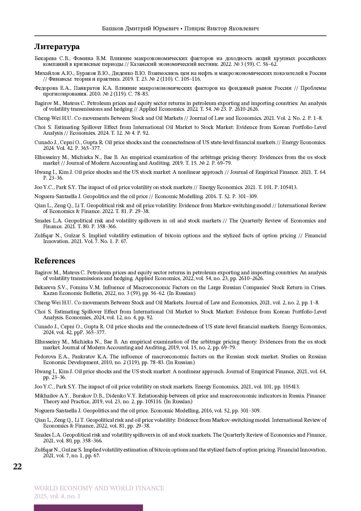 4. Bagirov M., Mateus C. Petroleum prices and equity sector returns in petroleum exporting and importing countries: An analysis of volatility transmissions and hedging // Applied Economics. 2022. Т. 54. № 23. P. 2610-2626.