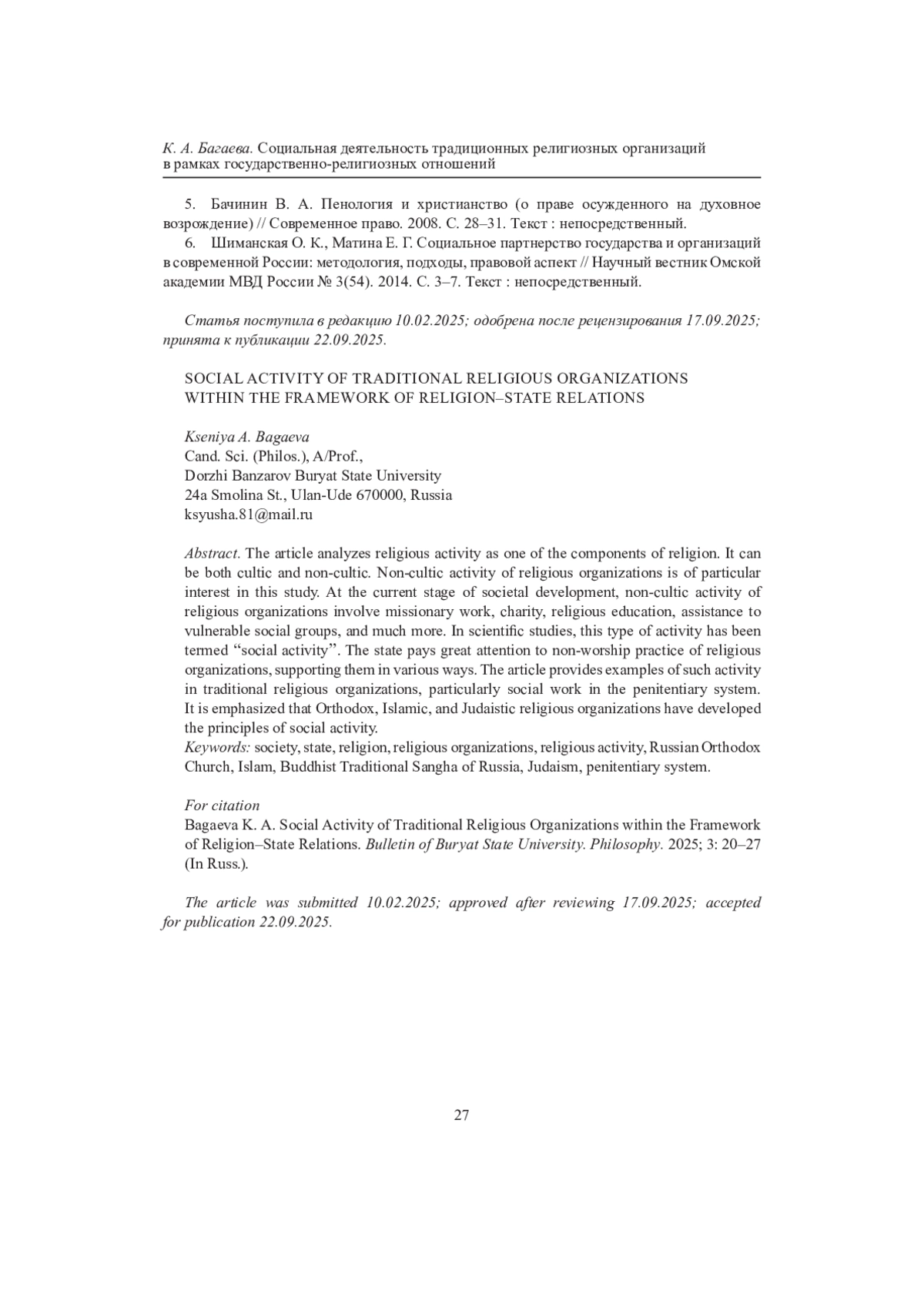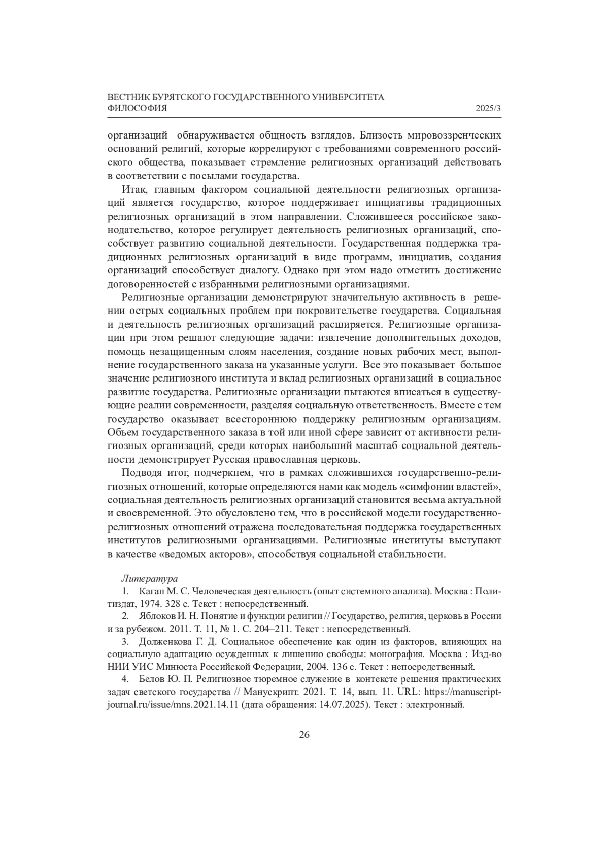 4. Белов Ю. П. Религиозное тюремное служение в контексте решения практических задач светского государства // Манускрипт. 2021. Т. 14, вып. 11. URL: https://manuscript-journal.ru/issue/mns.2021.14.11 (дата обращения: 14.07.2025). Текст: электронный.