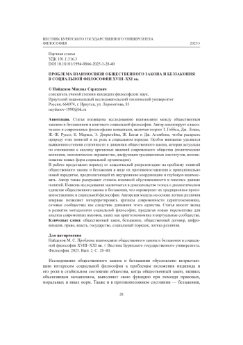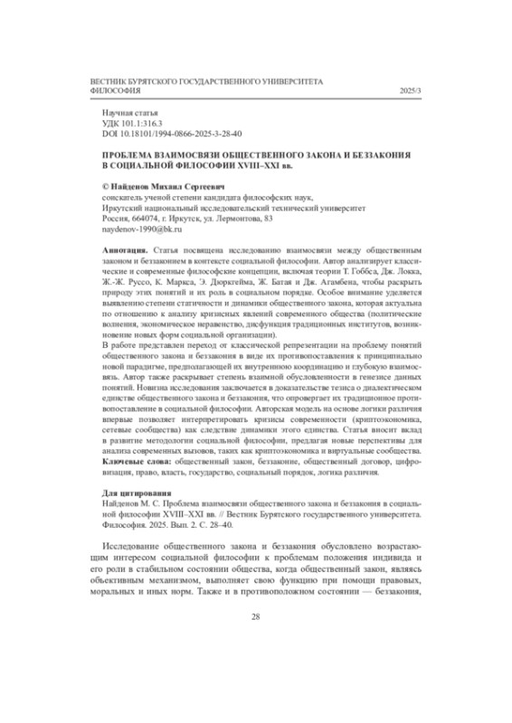 НАЙДЕНОВ М. С. ПРОБЛЕМА ВЗАИМОСВЯЗИ ОБЩЕСТВЕННОГО ЗАКОНА И БЕЗЗАКОНИЯ В СОЦИАЛЬНОЙ ФИЛОСОФИИ XVIII-XXI ВВ // ВЕСТНИК БУРЯТСКОГО ГОСУДАРСТВЕННОГО УНИВЕРСИТЕТА. 2025. № 3