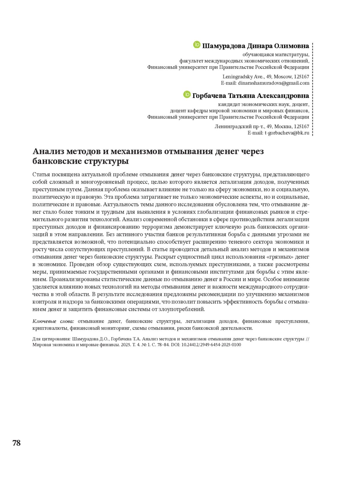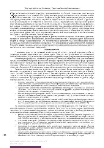 10. Танющева Н.Ю., Исакова Э.Т. Оценка масштабов отмывания денег в России // Вопросы экономики. 2024. № 10. С. 77-93.