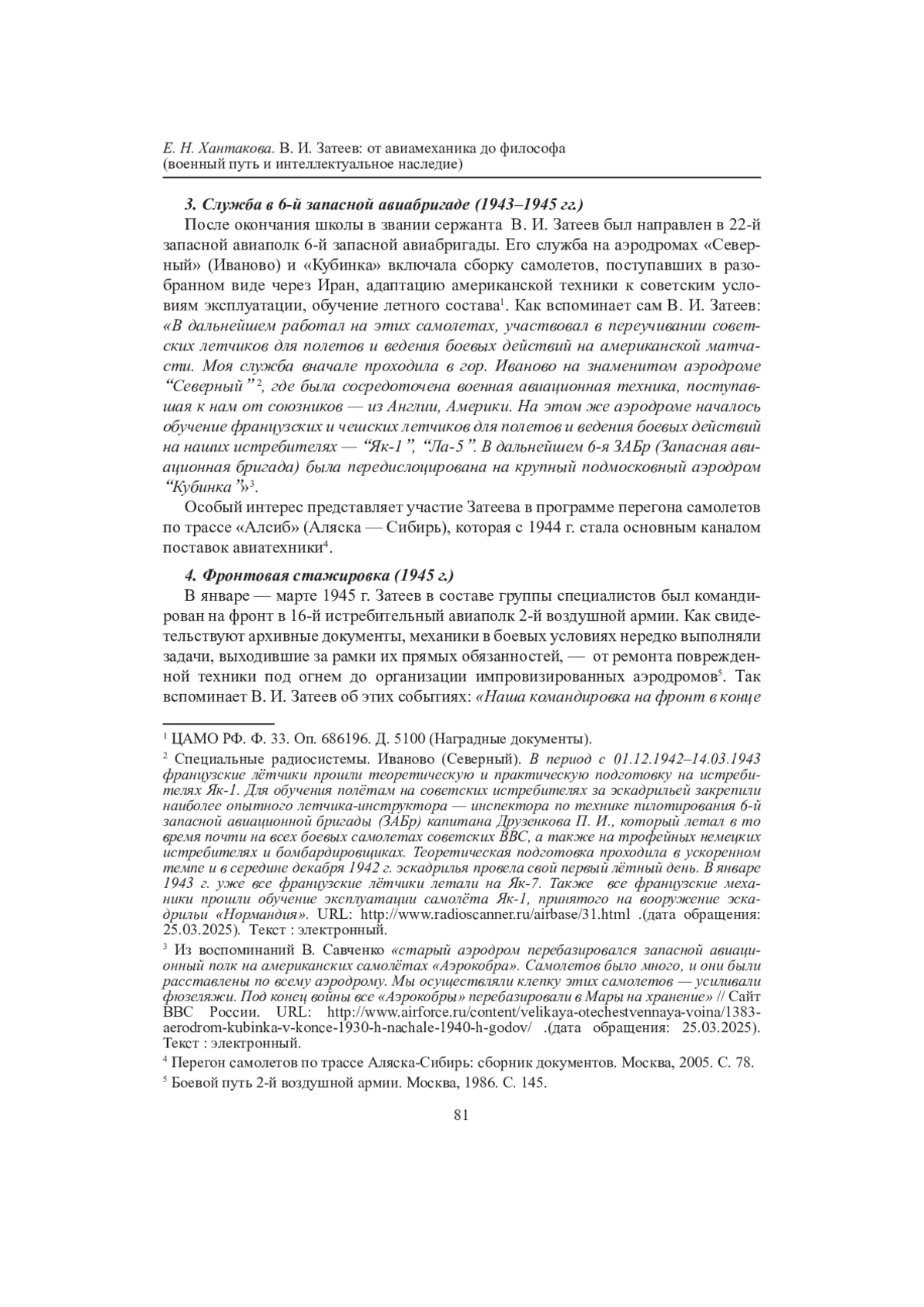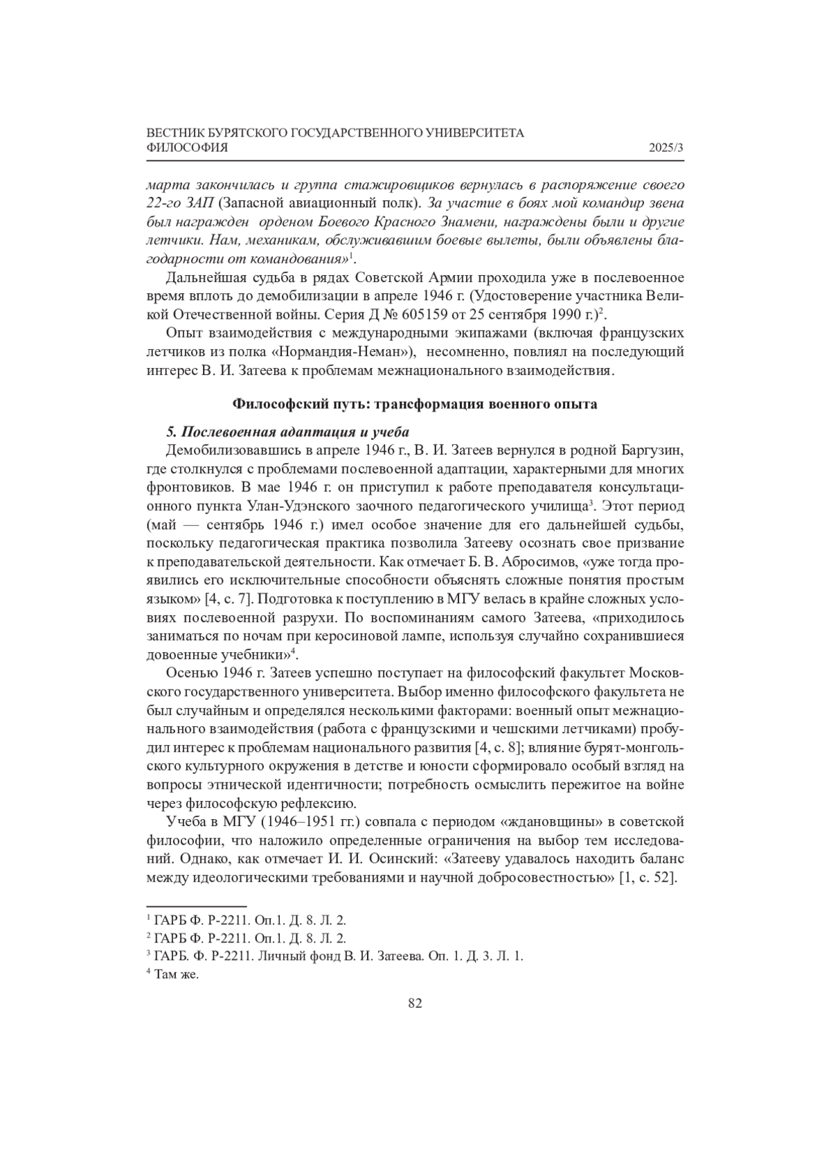 ХАНТАКОВА Е. Н. В. И. ЗАТЕЕВ: ОТ АВИАМЕХАНИКА ДО ФИЛОСОФА (ВОЕННЫЙ ПУТЬ И ИНТЕЛЛЕКТУАЛЬНОЕ НАСЛЕДИЕ) // ВЕСТНИК БУРЯТСКОГО ГОСУДАРСТВЕННОГО УНИВЕРСИТЕТА. 2025. № 3