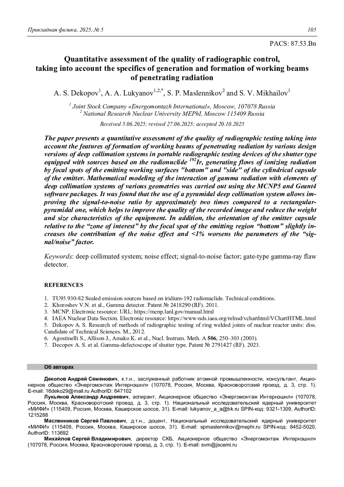 ДЕКОПОВ А. С., ЛУКЬЯНОВ А. А., МАСЛЕННИКОВ С. П., МИХАЙЛОВ С. В. КОЛИЧЕСТВЕННАЯ ОЦЕНКА КАЧЕСТВА РАДИОГРАФИЧЕСКОГО КОНТРОЛЯ С УЧЕТОМ СПЕЦИФИКИ ГЕНЕРАЦИИ И ФОРМИРОВАНИЯ РАБОЧИХ ПУЧКОВ ПРОНИКАЮЩЕГО ИЗЛУЧЕНИЯ // ПРИКЛАДНАЯ ФИЗИКА. 2025. №5