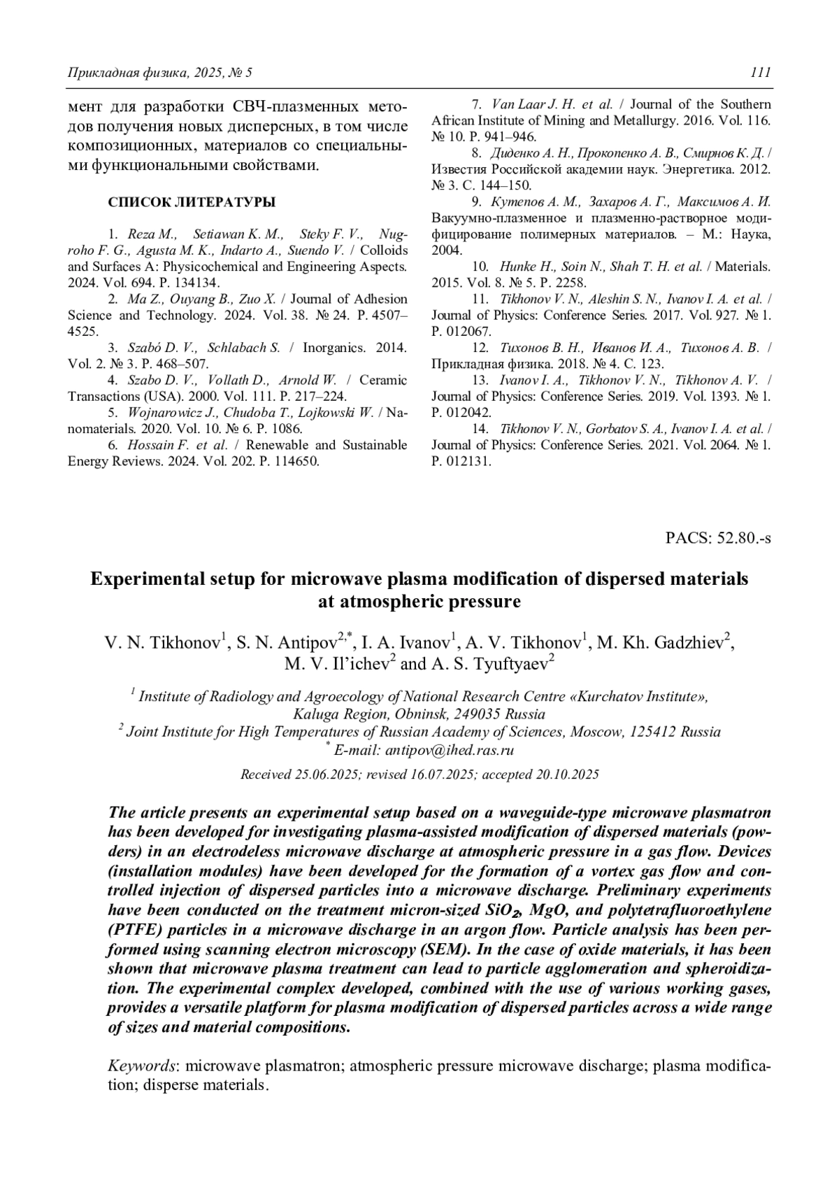 ТИХОНОВ В. Н., АНТИПОВ С. Н., ИВАНОВ И. А., ТИХОНОВ А. В., ГАДЖИЕВ М. Х., ИЛЬИЧЕВ М. В., ТЮФТЯЕВ А. С. ЭКСПЕРИМЕНТАЛЬНЫЙ КОМПЛЕКС ДЛЯ СВЧ-ПЛАЗМЕННОЙ МОДИФИКАЦИИ ДИСПЕРСНЫХ МАТЕРИАЛОВ ПРИ АТМОСФЕРНОМ ДАВЛЕНИИ // ПРИКЛАДНАЯ ФИЗИКА. 2025. №5
