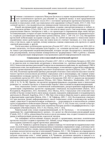 Начиная с испанского социолога Мануэля Кастельса в оценке медиакоммуникаций массового политического протеста для событий т. н. «арабской весны» и всех представителей т. н. «цветных революций» после 2011 г. постоянно проводится противопоставление телевидения и социальных сетей, где социальные сети одерживают победу [Castels, 2015. P. 244]. Этот «сетевой протест» стал выдвигаться как универсальная технология противостояния власти.
