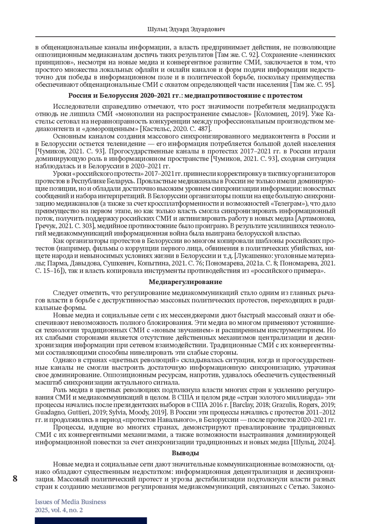 14. Шульц Э.Э. Медийные принципы формирования повестки дня в современной России // Коммуникационный вектор - 2024. Материалы симпозиума: сборник статей / под ред. А.Н. Чумикова, Э.Э. Шульца. М.: Блок-Принт, 2024. С. 241-251.