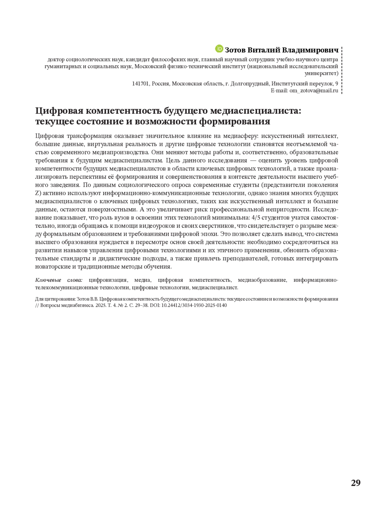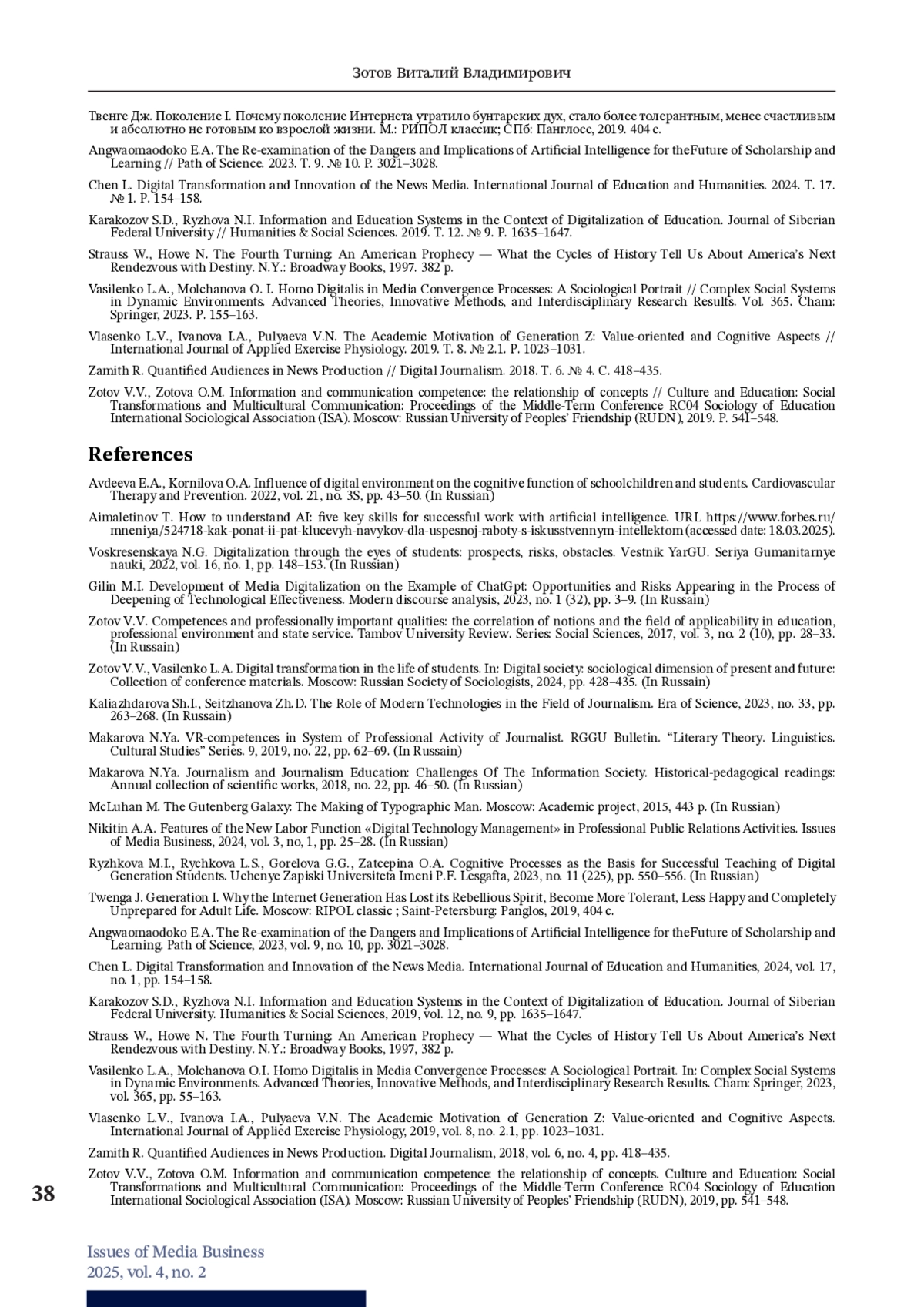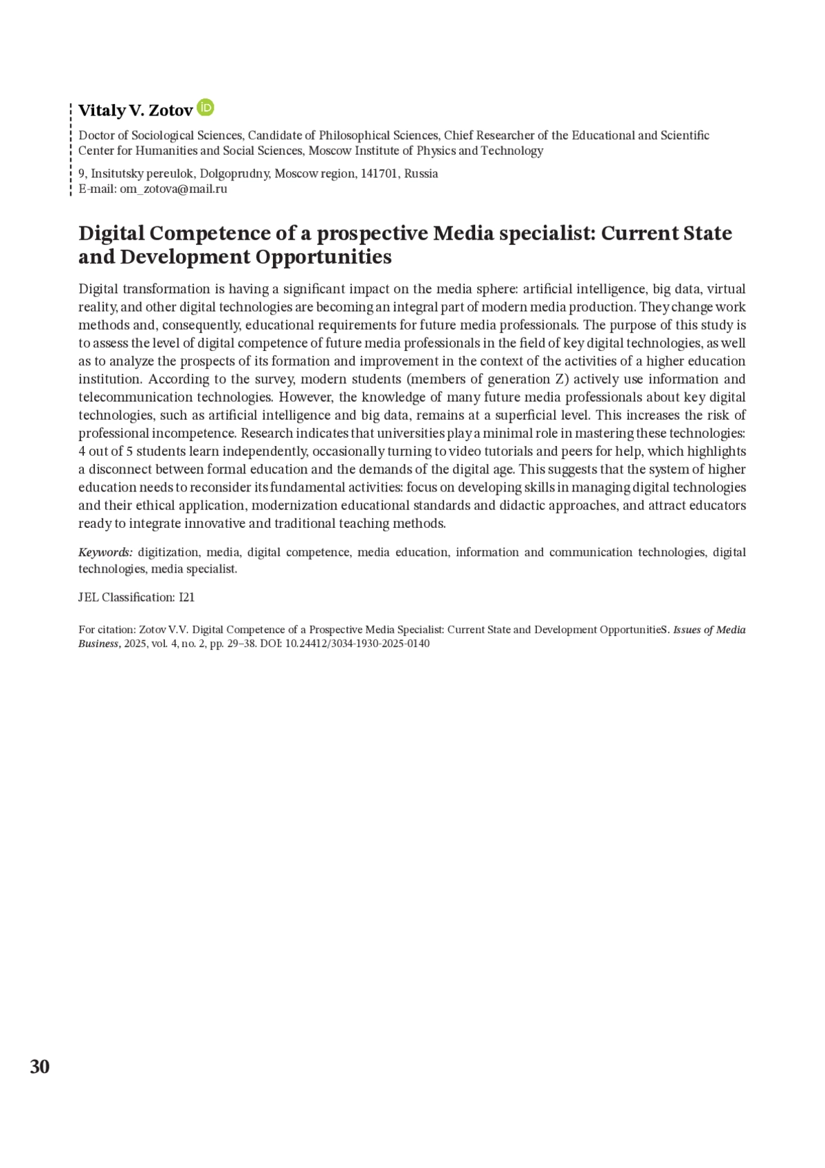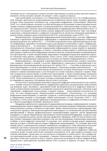 ЗОТОВ В. В. ЦИФРОВАЯ КОМПЕТЕНТНОСТЬ БУДУЩЕГО МЕДИАСПЕЦИАЛИСТА: ТЕКУЩЕЕ СОСТОЯНИЕ И ВОЗМОЖНОСТИ ФОРМИРОВАНИЯ // ВОПРОСЫ МЕДИАБИЗНЕСА. 2025. № 2, ТОМ 4