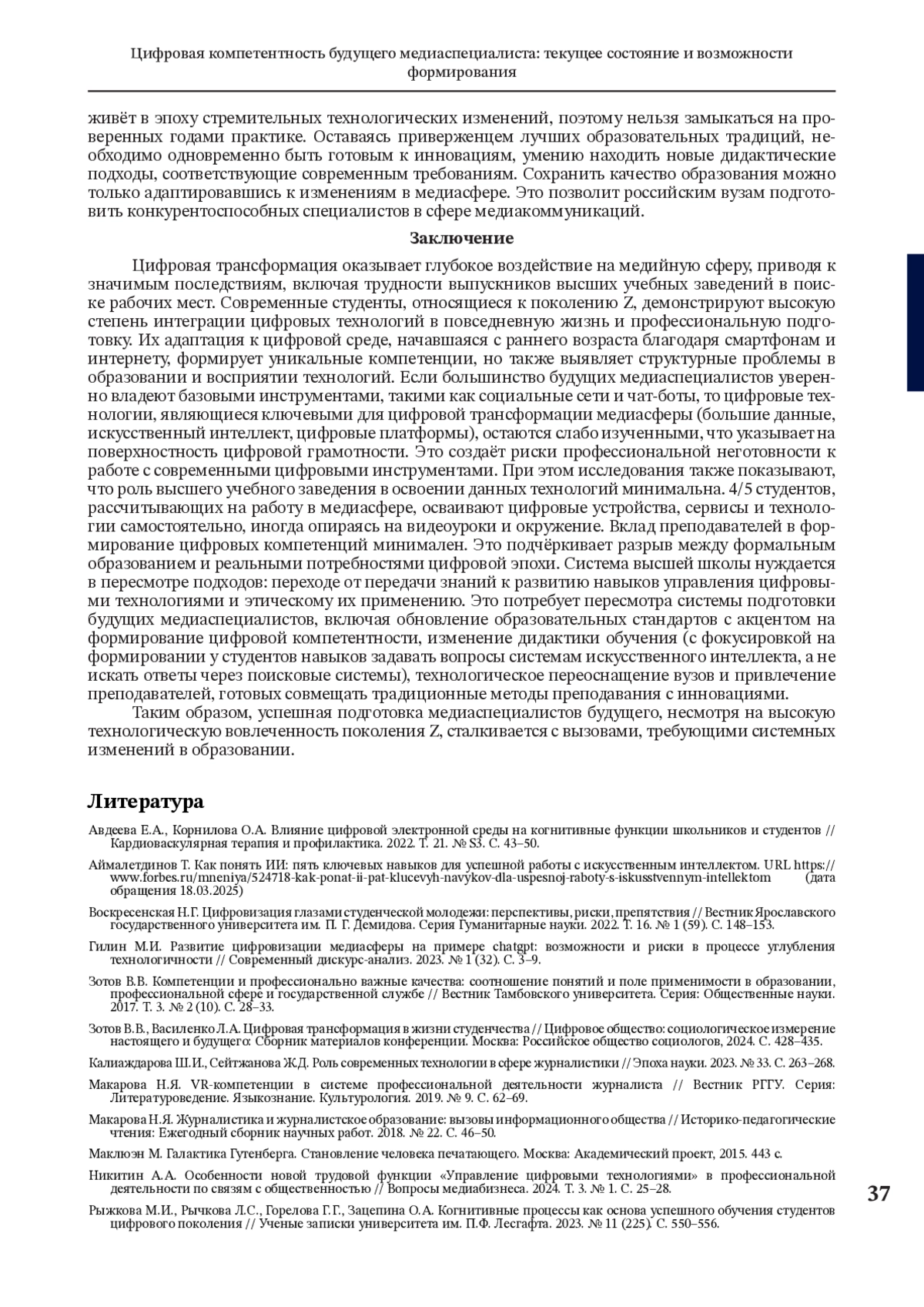 Статья: ЦИФРОВАЯ КОМПЕТЕНТНОСТЬ БУДУЩЕГО МЕДИАСПЕЦИАЛИСТА: ТЕКУЩЕЕ СОСТОЯНИЕ И ВОЗМОЖНОСТИ ФОРМИРОВАНИЯ (2025)