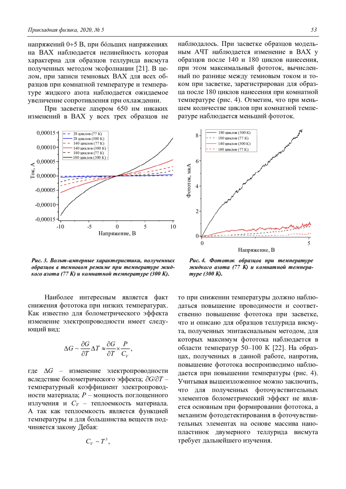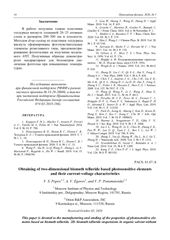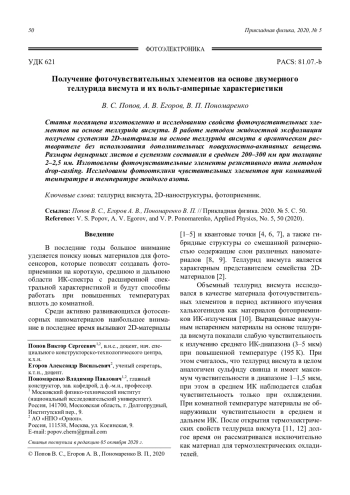 Попов В. С., Егоров А. В., Пономаренко В. П. Получение фоточувствительных элементов на основе двумерного теллурида висмута и их вольт-амперные характеристики 50