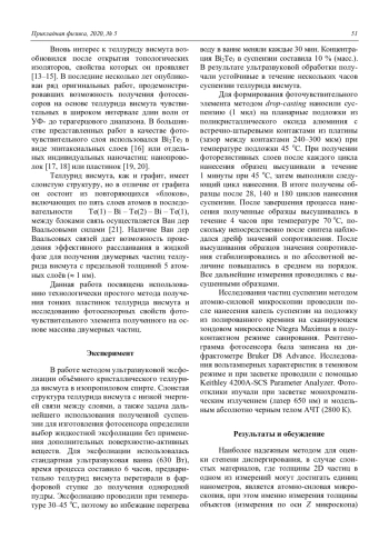 Статья посвящена изготовлению и исследованию свойств фоточувствительных элементов на основе теллурида висмута. В работе методом жидкостной эксфолиации получены суспензии 2D-материала на основе теллурида висмута в органическом растворителе без использования дополнительных поверхностно-активных веществ. Размеры двумерных листов в суспензии составили в среднем 200–300 нм при толщине 2–2,5 нм. Изготовлены фоточувствительные элементы резистивного типа методом drop-casting. Исследованы фотоотклики чувствительных элементов при комнатной температуре и температуре жидкого азота.