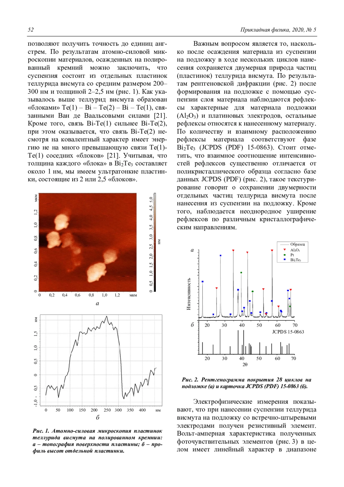 В работе получены тонкие пластинки теллурида висмута толщиной 20–25 атомных слоев и размером 200–300 нм в плоскости. Методом drop-casting из пластинок теллурида висмута сформированы фоточувствительные элементы резистивного типа, продемонстрировавшие фотоотклики на излучение модельного АЧТ. Полученные образцы демонстрируют нехарактерное для болометров увеличение фототока при повышенных температурах.