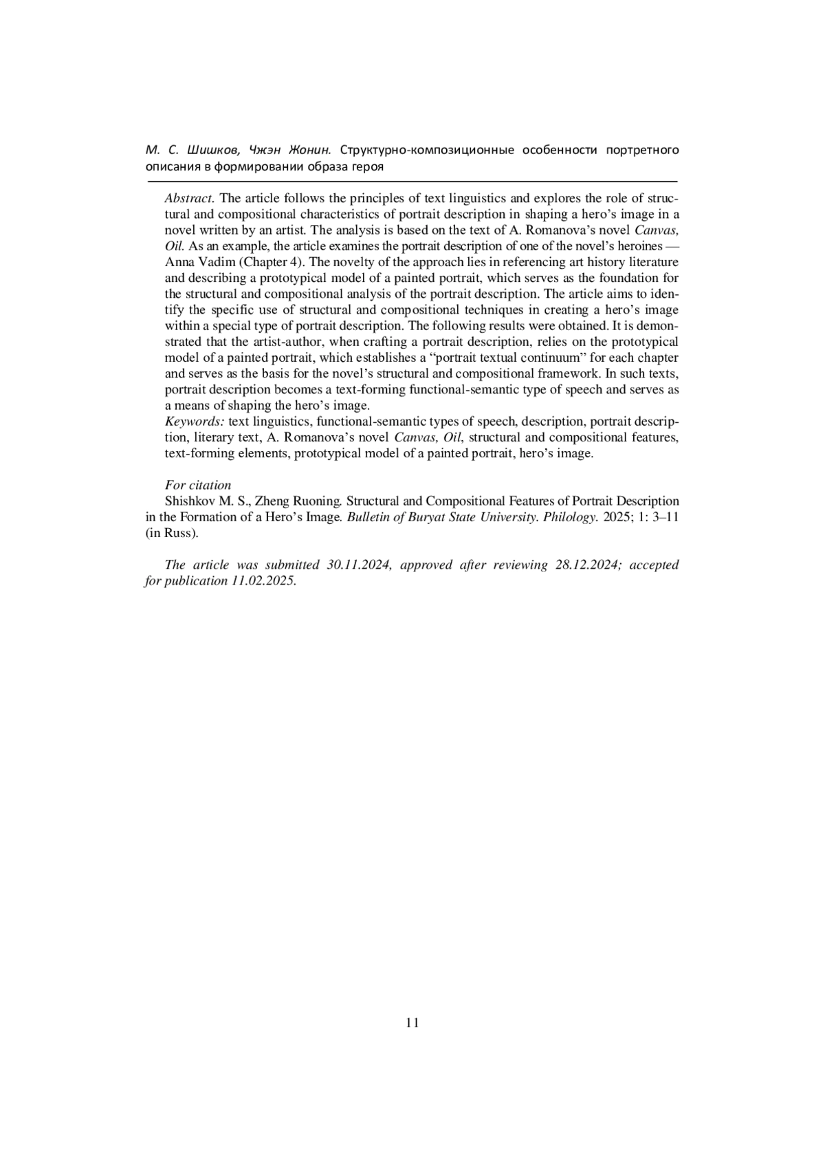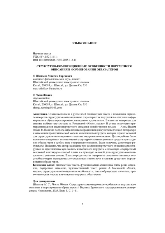 Статья выполнена в русле идей лингвистики текста и посвящена определению роли структурно-композиционных характеристик портретного описания в формировании образа героя в романе, написанном художником. В качестве материала для анализа выбран текст романа А. Романовой «Холст, масло». В статье в качестве примера приводится анализ портретного описания одной героини романа - Анны Вадим (глава 4). Новизна подхода определяется обращением к искусствоведческой литературе и описанием прототипической модели живописного портрета, которая служит основой для структурно-композиционного анализа портретного описания. Целью работы было выявление специфики использования структурно-композиционных средств при создании образа героя в особом типе портретного описания. Были получены следующие результаты. Показано, что автор-художник при создании портретного описания ориентируется на прототипическую модель живописного портрета, создающую «портретный текстовый континуум» каждой главы и служащую основой для структурно-композиционного решения романа. В такого рода текстах портретное описание становится текстообразующим функционально-смысловым типом речи и служит средством формирования образа героя.