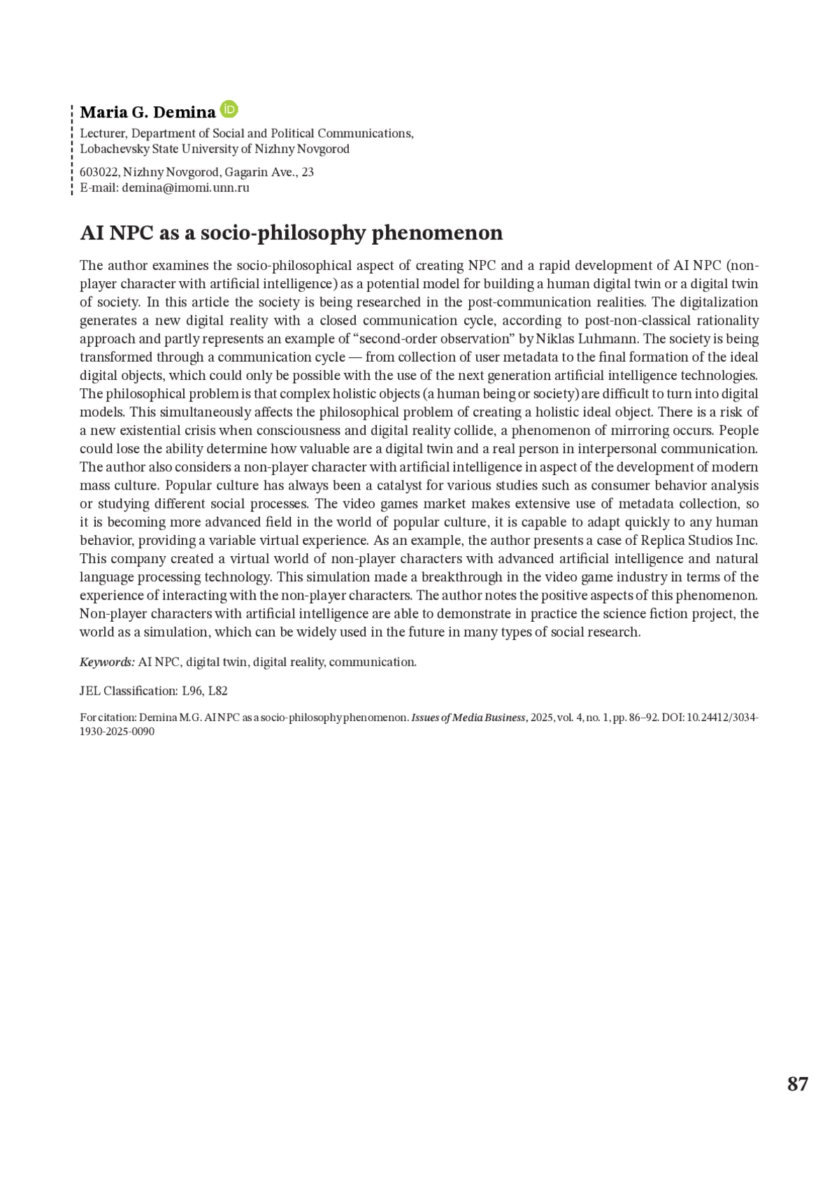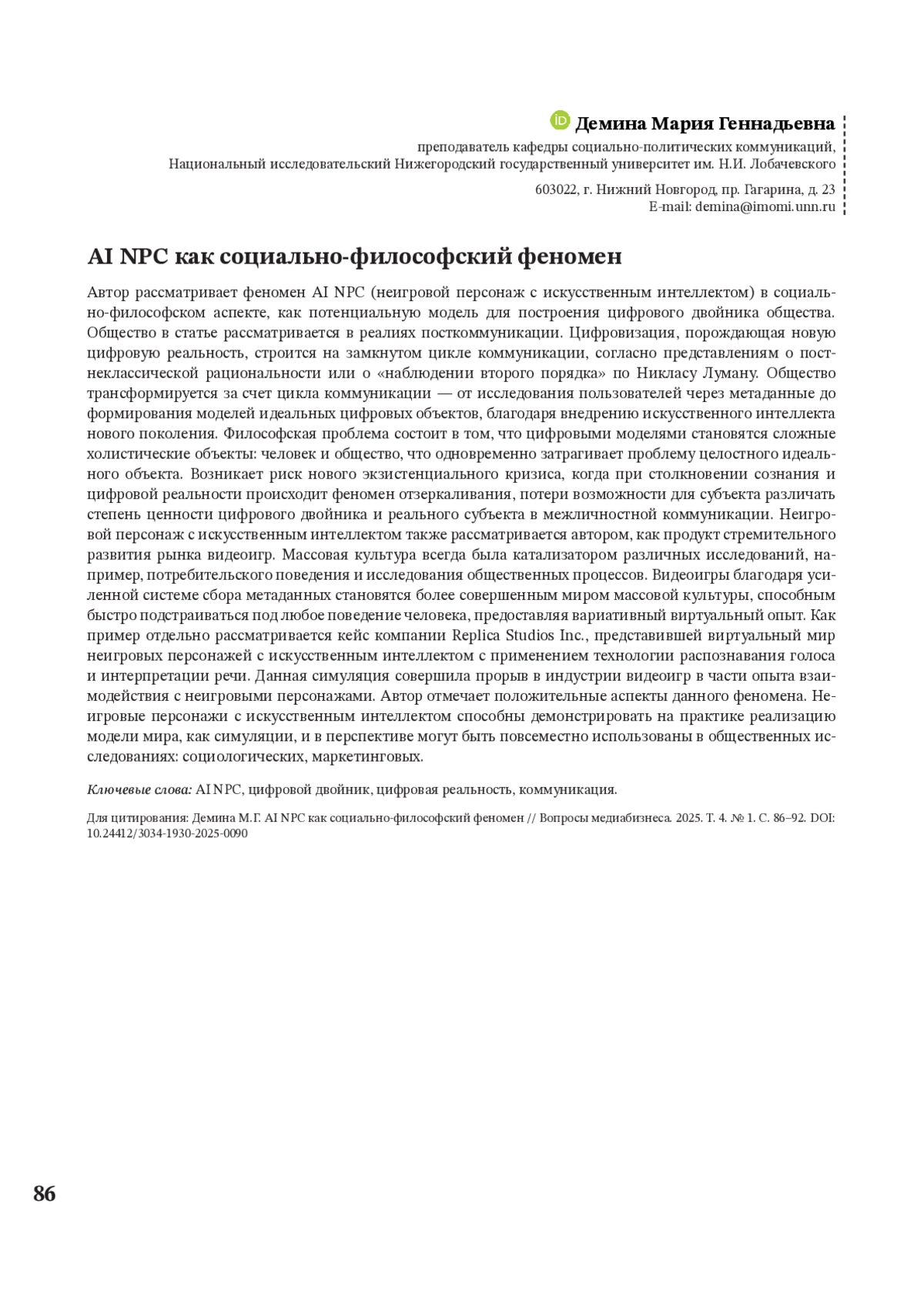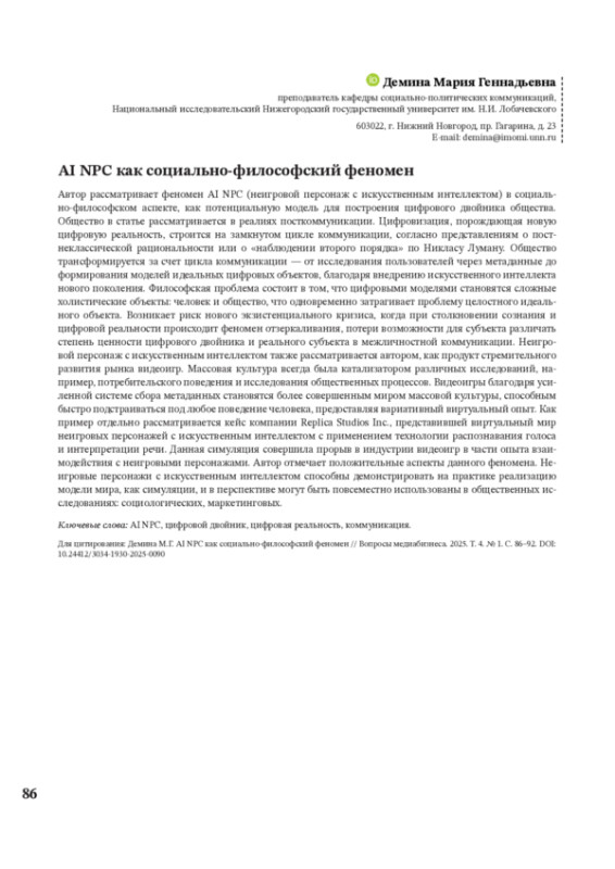 ДЕМИНА М. Г. AI NPC КАК СОЦИАЛЬНО-ФИЛОСОФСКИЙ ФЕНОМЕН // ВОПРОСЫ МЕДИАБИЗНЕСА. 2025. № 1, ТОМ 4