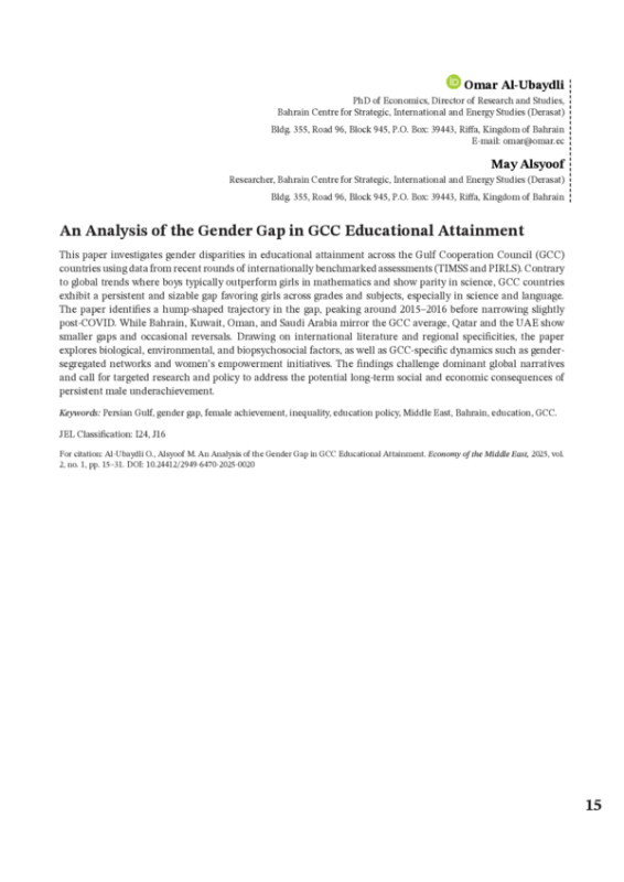 В данной работе исследуется гендерное неравенство в уровне образования в странах Совета сотрудничества арабских государств Персидского залива (ССАГПЗ) на основе данных последних раундов международных сравнительных оценок (TIMSS и PIRLS). В отличие от мировых тенденций, где мальчики, как правило, превосходят девочек по математике и демонстрируют паритет в естественных науках, в странах ССАГПЗ наблюдается устойчивый и значительный разрыв в пользу девочек по классам и предметам, особенно по естественным наукам и языкам. В работе рассматривается горбообразная траектория этого разрыва, достигшая пика примерно в 2015–2016 гг., а затем несколько сократившаяся после пандемии COVID-19. В то время как в Бахрейне, Кувейте, Омане и Саудовской Аравии наблюдается меньший разрыв, а иногда и обратный. Опираясь на международную литературу и региональную специфику, в статье рассматриваются биологические, экологические и биопсихосоциальные факторы, а также динамика, характерная для ССАГПЗ, такая как гендерно-сегрегированные сети и инициативы по расширению прав и возможностей женщин. Полученные результаты ставят под сомнение доминирующие мировые представления и требуют целенаправленных исследований и разработки политики для устранения потенциальных долгосрочных социальных и экономических последствий сохраняющейся низкой успеваемости мужчин.