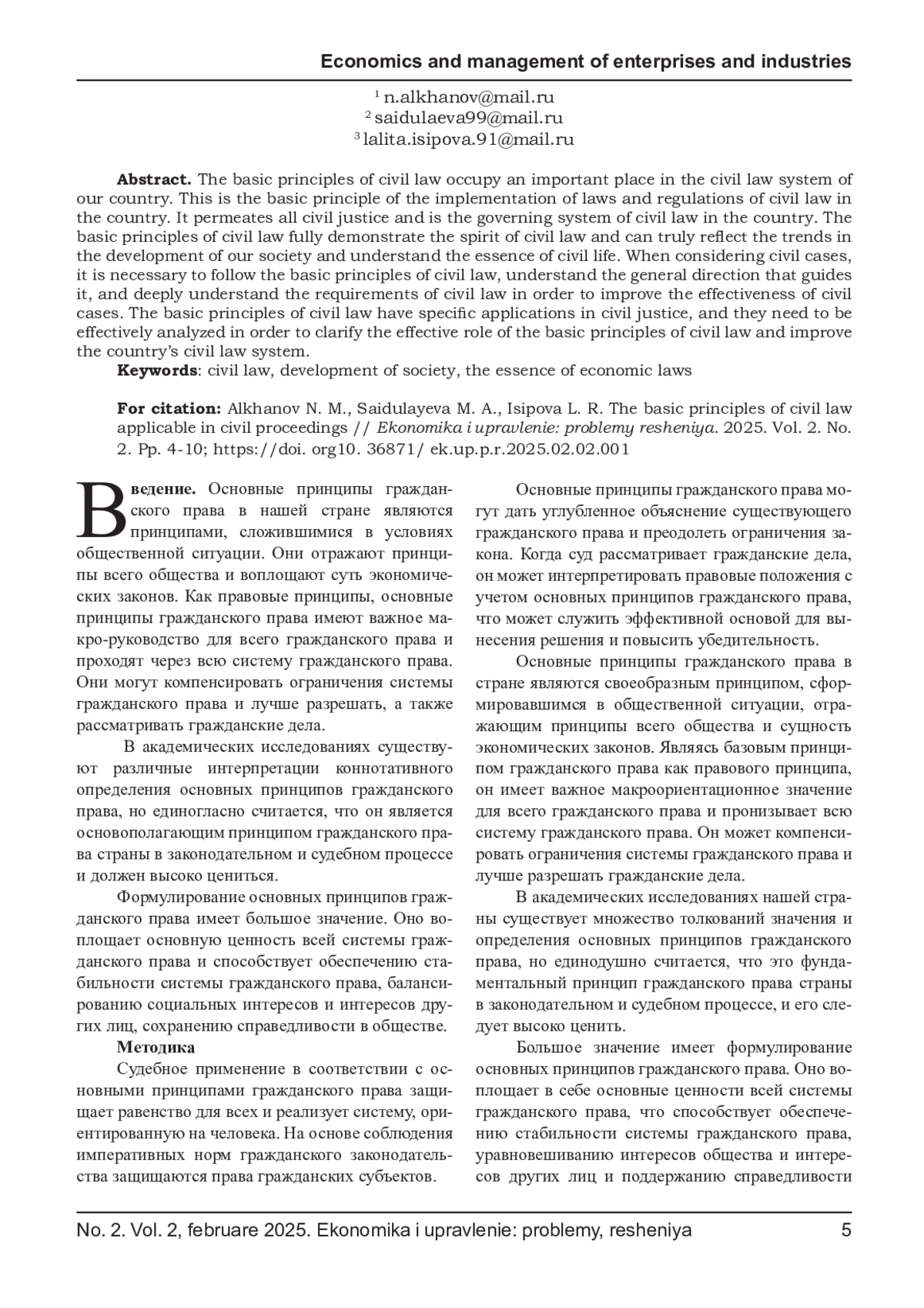 АЛЬХАНОВ Н. М., САЙДУЛАЕВА М. А., ИСИПОВА Л. Р. ОСНОВНЫЕ ПРИНЦИПЫ ГРАЖДАНСКОГО ПРАВА, ПРИМЕНИМЫЕ В ГРАЖДАНСКОМ СУДОПРОИЗВОДСТВЕ // ЭКОНОМИКА И УПРАВЛЕНИЕ: ПРОБЛЕМЫ, РЕШЕНИЯ. 2025. ТОМ 2 № 2