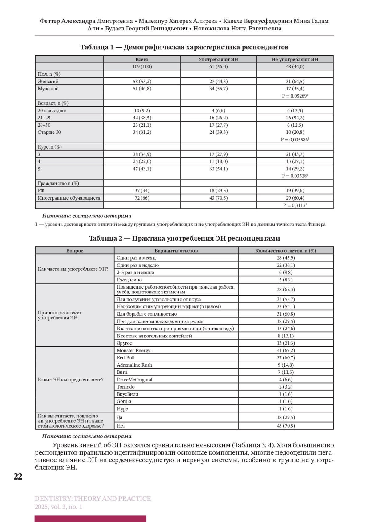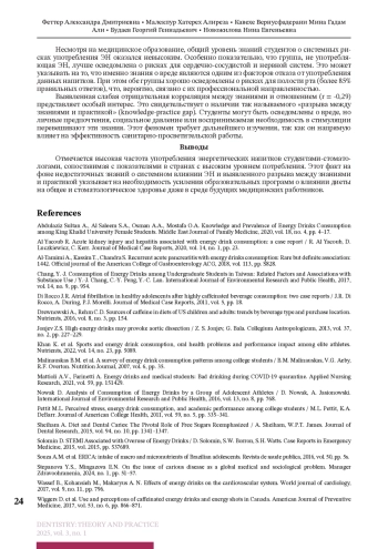 Статья: Взгляды, знания и практика студентов-стоматологов в отношении употребления энергетических напитков (2025)