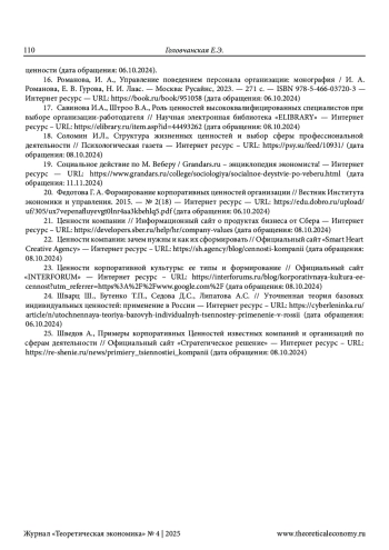 17. Савинова И.А., Штроо В.А., Роль ценностей высококвалифицированных специалистов при выборе организации-работодателя // Научная электронная библиотека “ELIBRARY” - Интернет ресурс - URL: https://elibrary.ru/item.asp?id=44493262 (дата обращения: 08.10.2024).