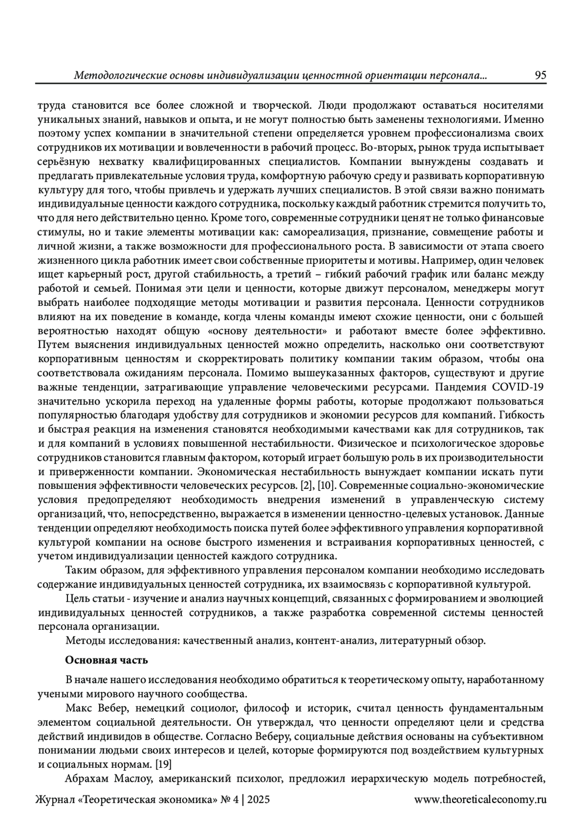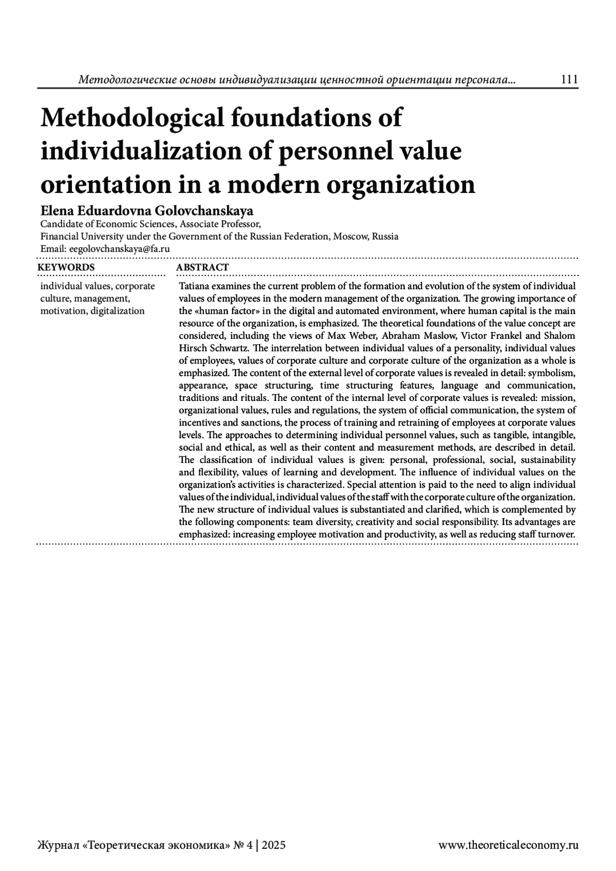 Статья рассматривает текущую проблему формирования и эволюции системы индивидуальных ценностей работников в современном управлении организацией. Подчеркивается растущее значение «человеческого фактора» в цифровой и автоматизированной среде, где человеческий капитал является основным ресурсом организации. Рассмотрены теоретические основы ценностной концепции, включая взгляды Макса Вебера, Авраама Маслоу, Виктора Франкеля и Шалома Хирша Шварца. Подчеркивается взаимосвязь между индивидуальными ценностями личности, индивидуальными ценностями сотрудников, ценностями корпоративной культуры и корпоративной культурой организации в целом. Детально раскрывается содержание внешнего уровня корпоративных ценностей: символика, внешний вид, структурирование пространства, особенности структурирования времени, язык и общение, традиции и ритуалы. Выявляется содержание внутреннего уровня корпоративных ценностей: миссия, организационные ценности, правила и нормы, система служебной коммуникации, система поощрений и санкций, процесс обучения и переобучения сотрудников уровней корпоративных ценностей. Подробно описаны подходы к определению индивидуальных ценностей персонала, такие как: материальные, нематериальные, социальные и этические, а также их содержание и методы измерения. Приводится классификация индивидуальных ценностей: личные, профессиональные, социальные, устойчивость и гибкость, ценности обучения и развития. Характеризуется влияние индивидуальных ценностей на деятельность организации. Особое внимание уделяется необходимости согласования индивидуальных ценностей личности, индивидуальных ценностей персонала с корпоративной культурой организации. Обоснована и уточнена новая структура индивидуальных ценностей, которая дополнена составляющими: разнообразие команды, креативность и социальная ответственность. Подчеркиваются ее преимущества: повышение мотивации и производительности сотрудников, а также снижение текучести кадров.