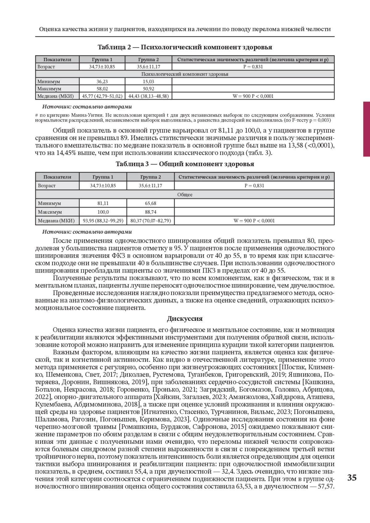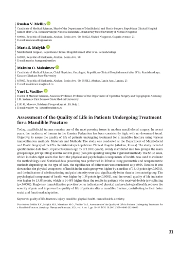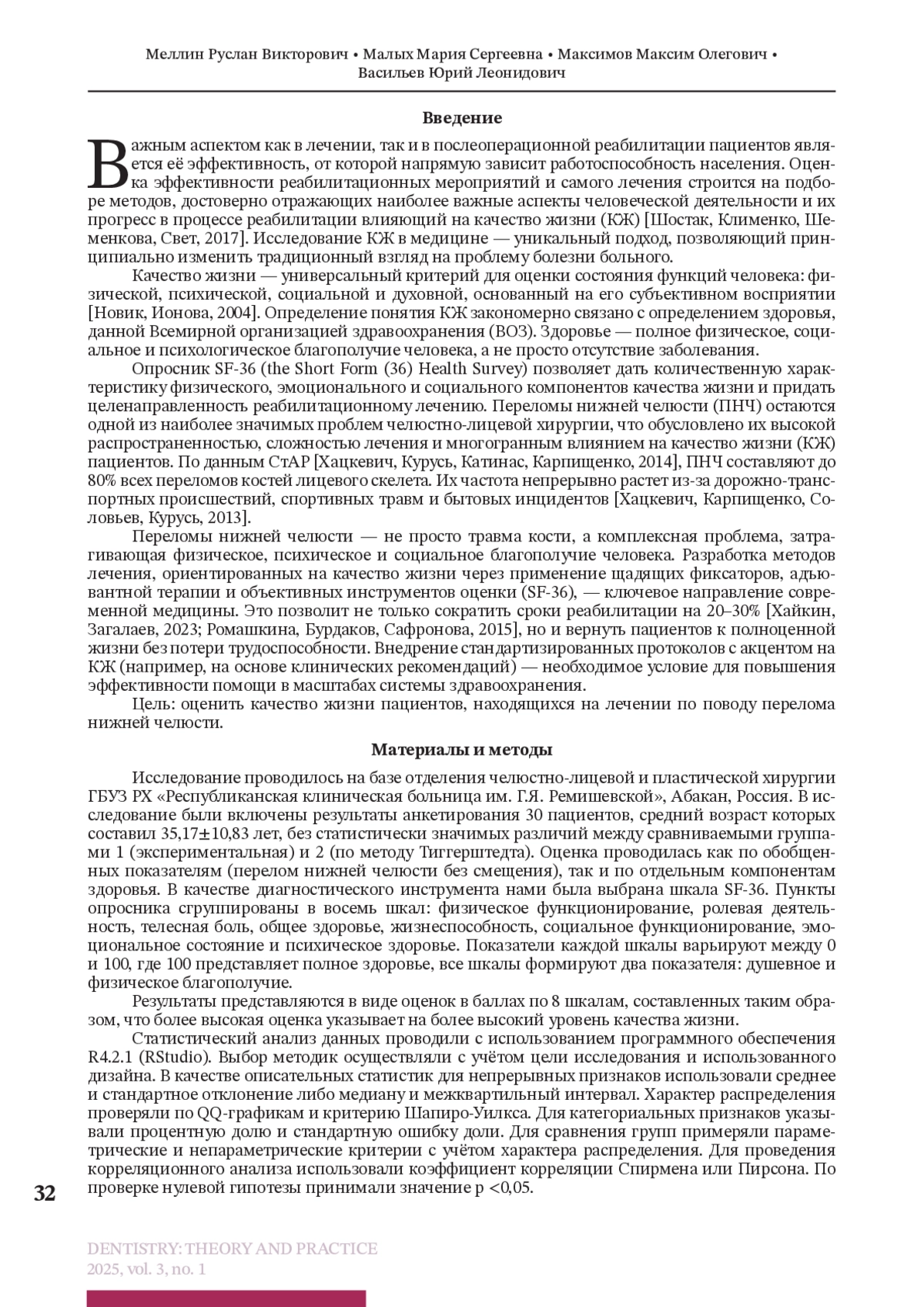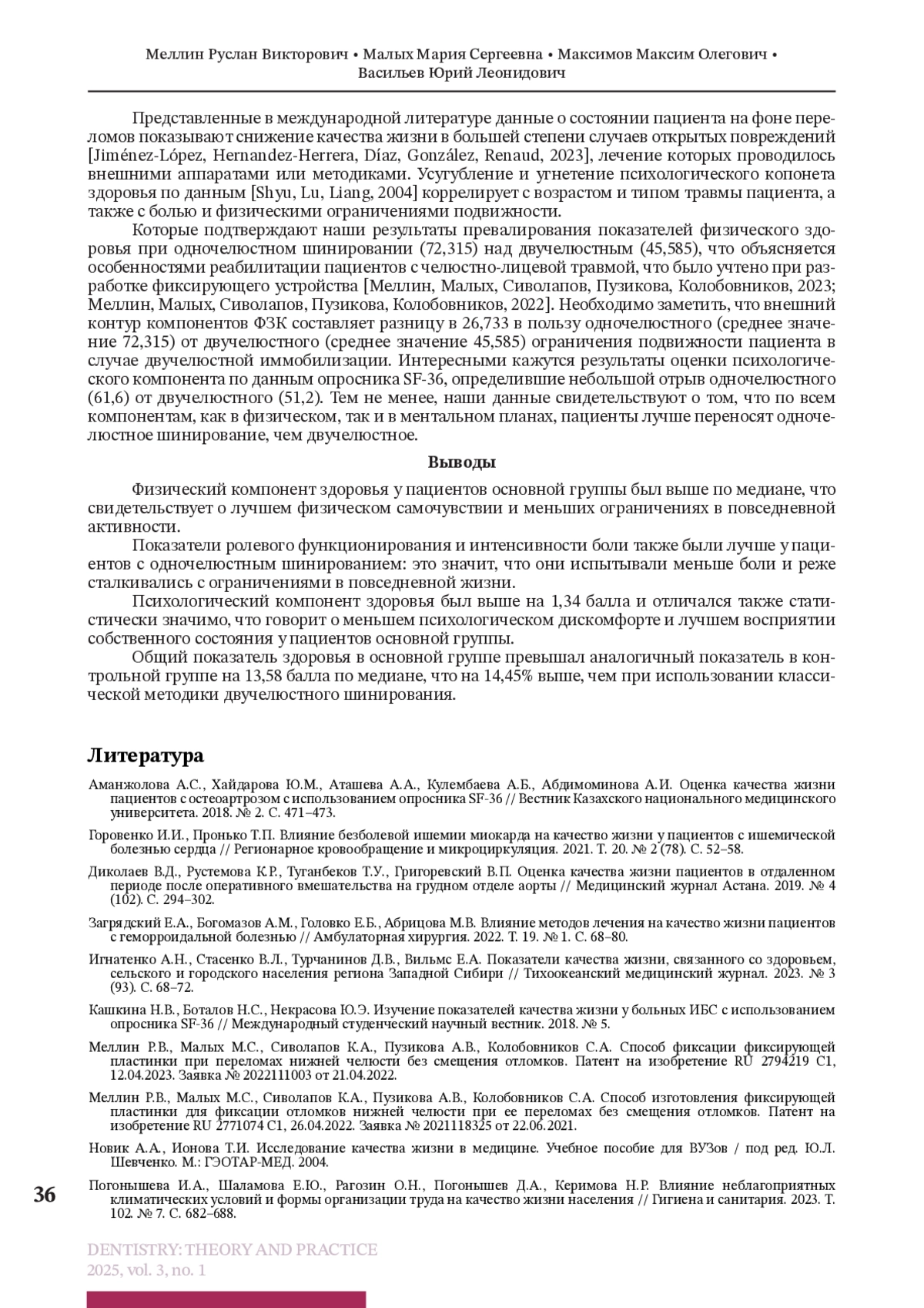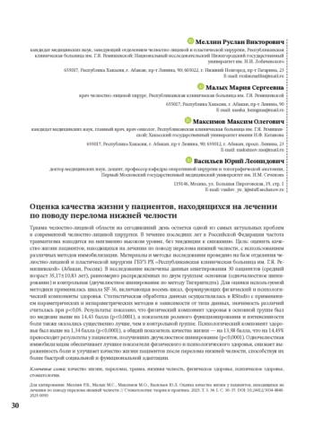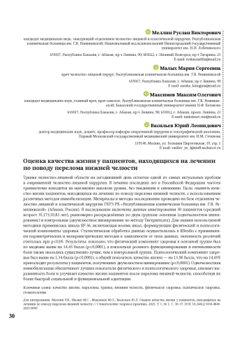 Травма челюстно-лицевой области на сегодняшний день остается одной из самых актуальных проблем в современной челюстно-лицевой хирургии. В течение последних лет в Российской Федерации частота травматизма находится на неизменно высоком уровне, без тенденции к снижению. Цель: оценить качество жизни пациентов, находящихся на лечении по поводу перелома нижней челюсти, с использованием различных методов иммобилизации. Материалы и методы: исследование проведено на базе отделения челюстно-лицевой и пластической хирургии ГБУЗ РХ «Республиканская клиническая больница им. Г. Я. Ремишевской» (Абакан, Россия). В исследование включены данные анкетирования 30 пациентов (средний возраст 35,17±10,83 лет), равномерно распределённых по двум группам: основная (одночелюстное шинирование) и контрольная (двучелюстное шинирование по методу Тигерштедта). Для оценки используемой методики применялась шкала SF-36, включающая восемь шкал, формирующих физический и психологический компоненты здоровья. Статистическая обработка данных осуществлялась в RStudio с применением параметрических и непараметрических методов в зависимости от типа данных, значимость различий считалась при p<0,05. Результаты: показано, что физический компонент здоровья в основной группе был по медиане выше на 14,43 балла (p<0,0001), а показатели ролевого функционирования и интенсивности боли также оказались существенно лучше, чем в контрольной группе. Психологический компонент здоровья был выше на 1,34 балла (p<0,0001), а общий показатель качества жизни — на 13,58 балла, что на 14,45% превосходит результаты у пациентов, получивших двучелюстное шинирование (p<0,0001). Одночелюстная иммобилизация обеспечивает лучшие показатели физического и психологического здоровья, снижает выраженность боли и улучшает качество жизни пациентов после перелома нижней челюсти, способствуя их более быстрой социальной и функциональной адаптации.