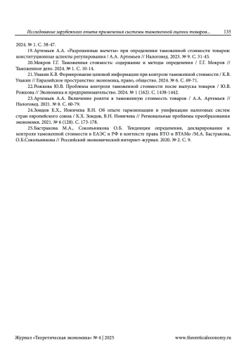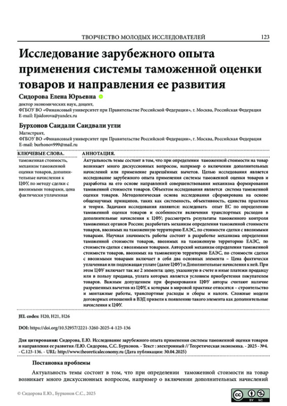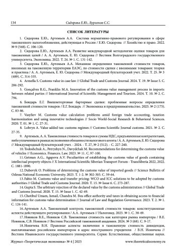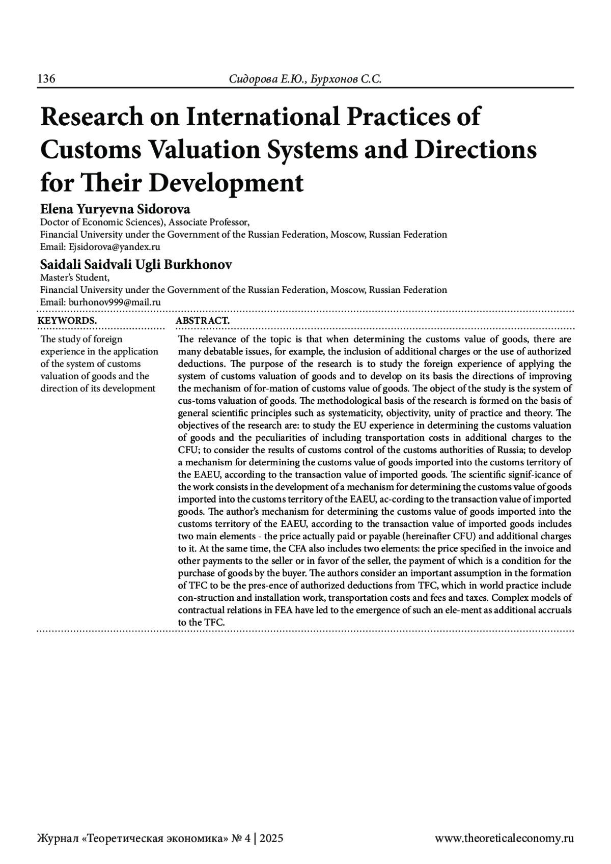 СИДОРОВА Е. Ю., БУРХОНОВ С.С.У. ИССЛЕДОВАНИЕ ЗАРУБЕЖНОГО ОПЫТА ПРИМЕНЕНИЯ СИСТЕМЫ ТАМОЖЕННОЙ ОЦЕНКИ ТОВАРОВ И НАПРАВЛЕНИЯ ЕЕ РАЗВИТИЯ // ТЕОРЕТИЧЕСКАЯ ЭКОНОМИКА. 2025. № 4 (124)