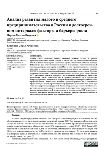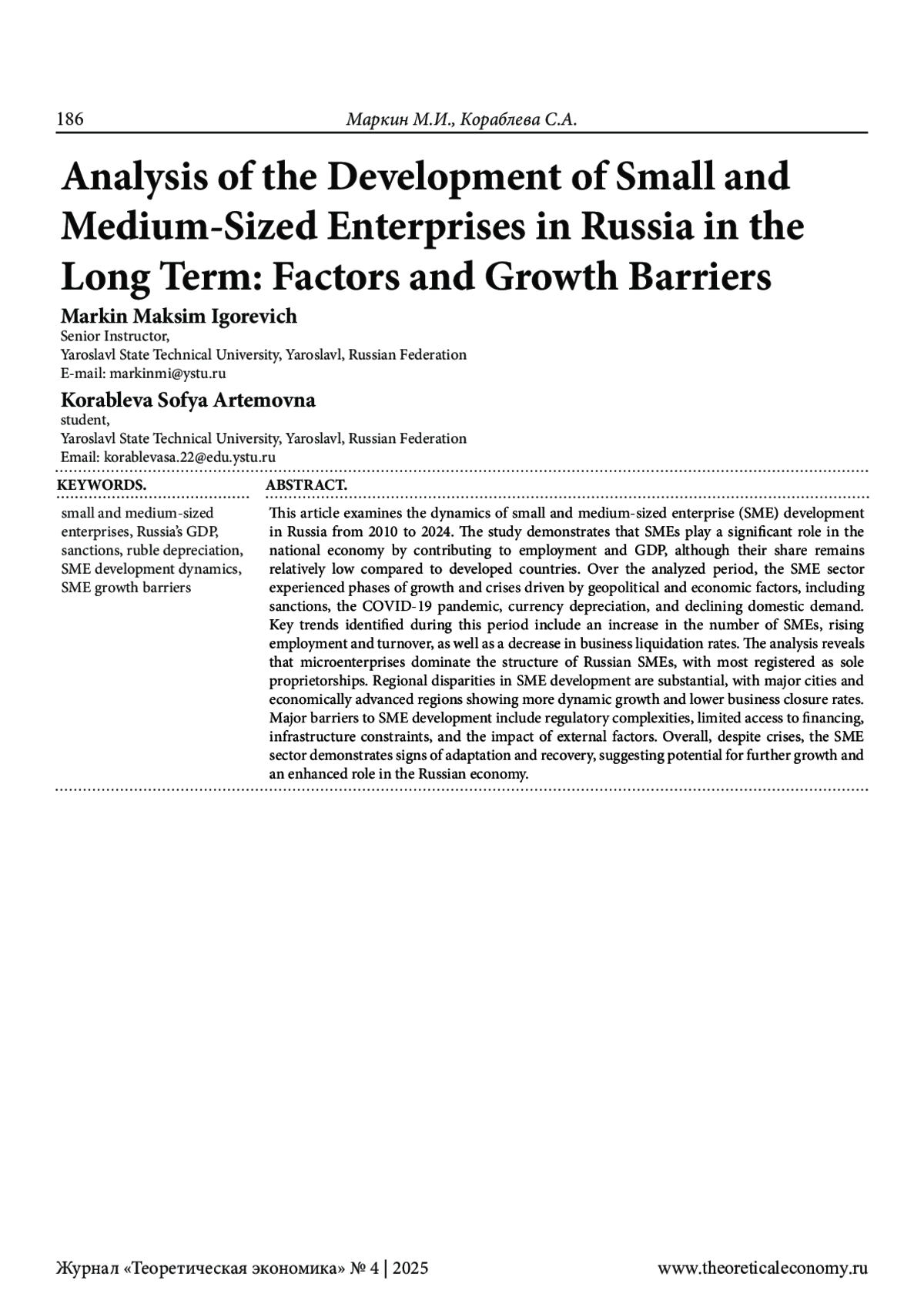 Данная статья посвящена анализу динамики развития малого и среднего предпринимательства в России в период с 2010 по 2024 год. Исследование показывает, что МСП играет важную роль в экономике страны, обеспечивая занятость и вклад в ВВП, хотя его доля остается относительно низкой по сравнению с развитыми странами. В течение рассматриваемого периода сектор МСП прошел через периоды роста и кризисов, связанных с геоэкономическими и экономическими, такими как санкции, пандемия COVID-19, обесценение национальной валюты и снижение внутреннего спроса. Основные тенденции, выявленные в рассматриваемый период, включают рост числа субъектов МСП, увеличение занятости и оборота, а также снижение коэффициента ликвидации предприятий. Анализ показывает, что в структуре российских МСП преобладают микропредприятия, а большая часть которых зарегистрирована в форме индивидуальных предпринимателей. Региональные различия в динамике развития МСП существенны: крупные города и развитые регионы демонстрируют более динамичный рост и меньшую число ликвидированных предприятий. Важными барьерами для развития МСП остаются регуляторные сложности, доступ к финансам, инфраструктурные ограничения, а также влияние внешних факторов. В целом, несмотря на кризисы, сектор МСП демонстрирует признаки адаптации и восстановления, что позволяет надеяться на дальнейший рост и укрепление роли этого сектора в российской экономике.