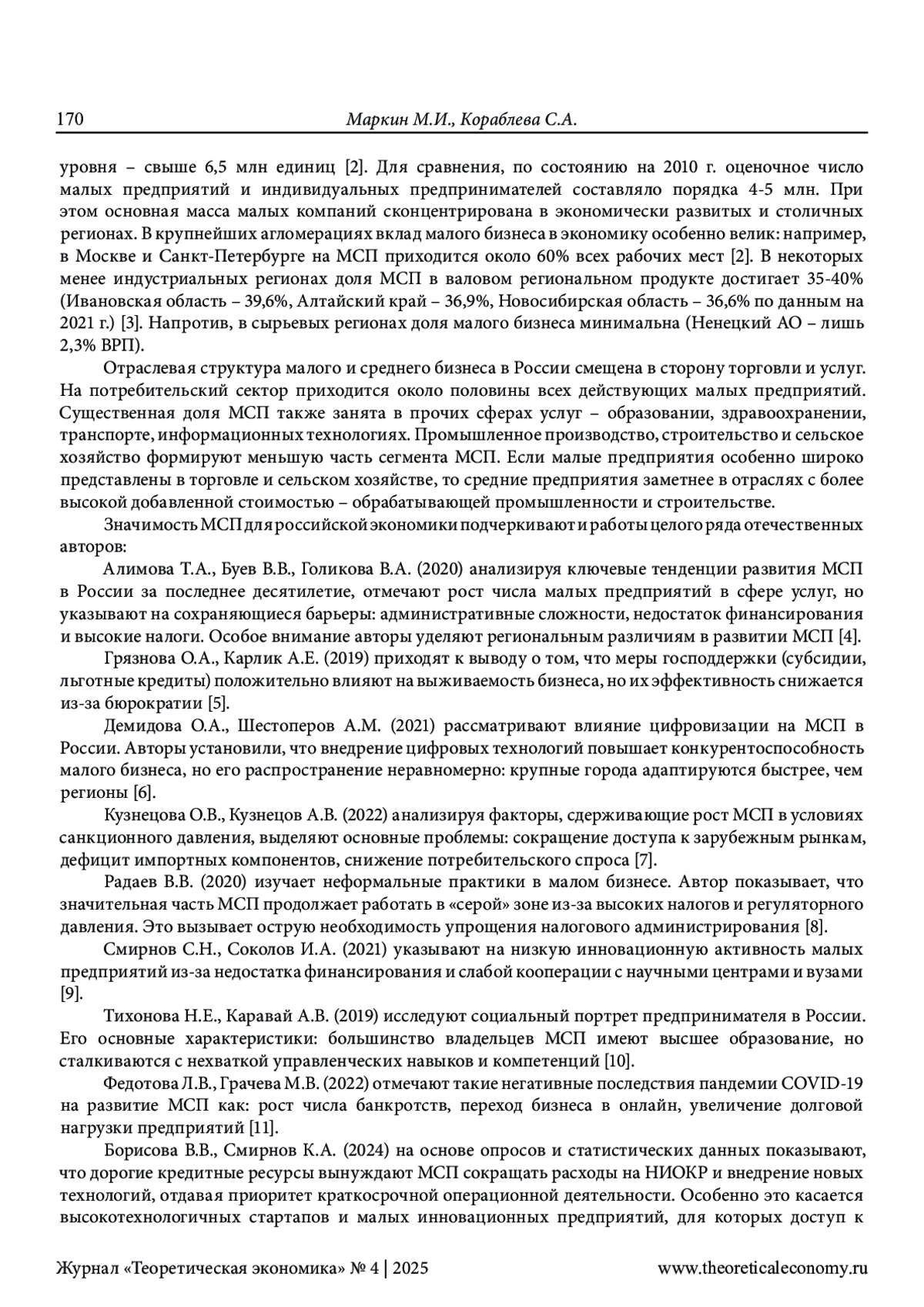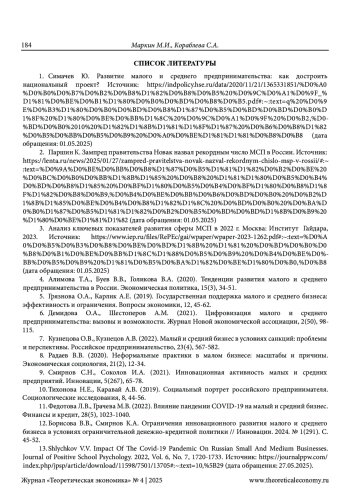 5. Грязнова О.А., Карлик А.Е. (2019). Государственная поддержка малого и среднего бизнеса: эффективность и ограничения. Вопросы экономики, 12, 45-62.
