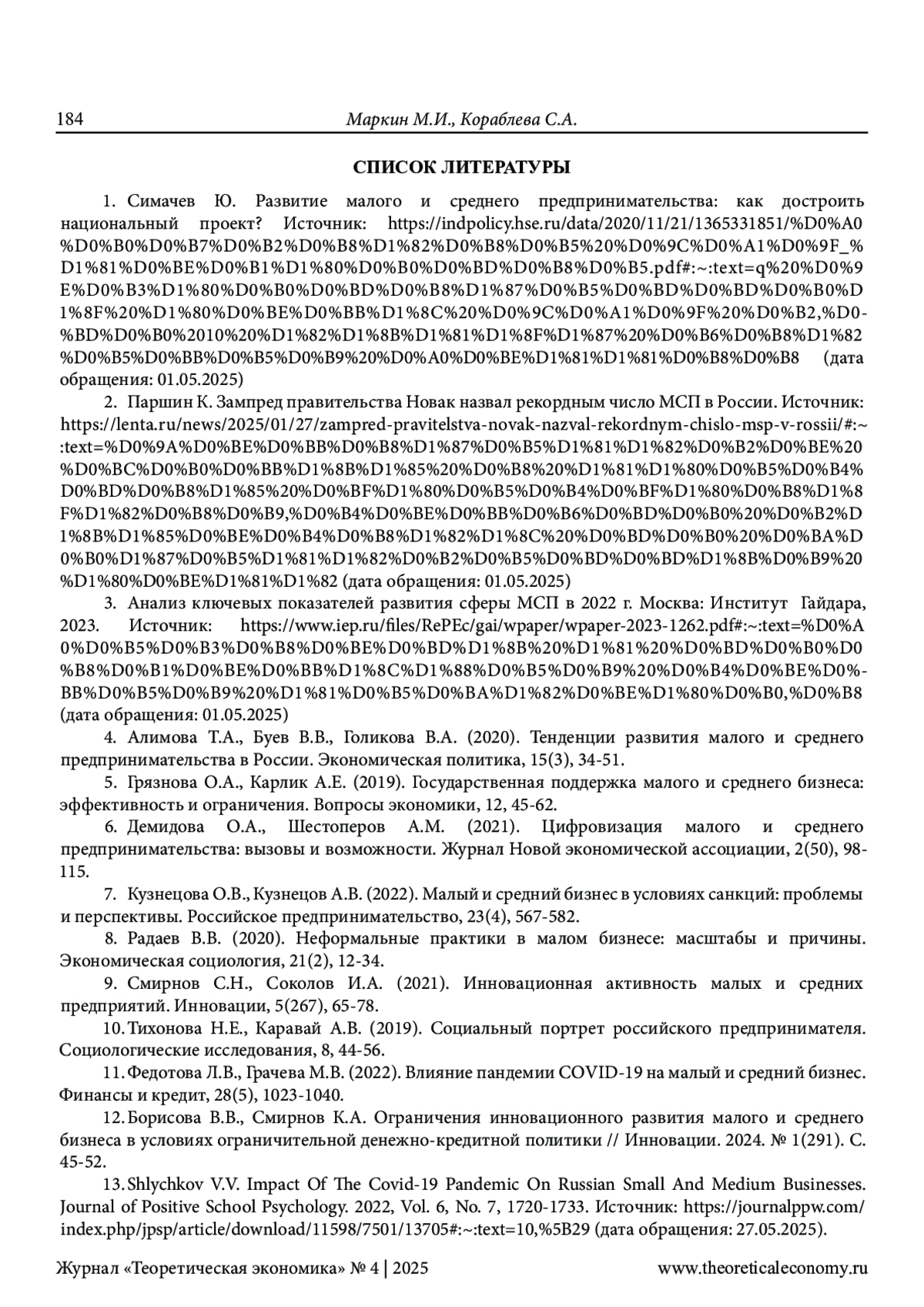 1. Симачев Ю. Развитие малого и среднего предпринимательства: как достроить национальный проект? Источник: https://indpolicy.hse.ru/data/2020/11/21/1365331851/%D0%A0%D0%B0%D0%B7%D0%B2%D0%B8%D1%82%D0%B8%D0%B5%20%D0%9C%D0%A1%D0%9F_%D1%81%D0%BE%D0%B1%D1%80%D0%B0%D0%BD%D0%B8%D0%B5.pdf#:~:text=q%20%D0%9E%D0%B3%D1%80%D0%B0%D0%BD%D0%B8%D1%87%D0%B5%D0%BD%D0%BD%D0%B0%D1%8F%20%D1%80%D0%BE%D0%BB%D1%8C%20%D0%9C%D0%A1%D0%9F%20%D0%B2,%D0%BD%D0%B0%2010%20%D1%82%D1%8B%D1%81%D1%8F%D1%87%20%D0%B6%D0%B8%D1%82%D0%B5%D0%BB%D0%B5%D0%B9%20%D0%A0%D0%BE%D1%81%D1%81%D0%B8%D0%B8 (дата обращения: 01.05.2025).