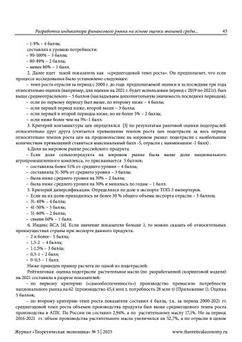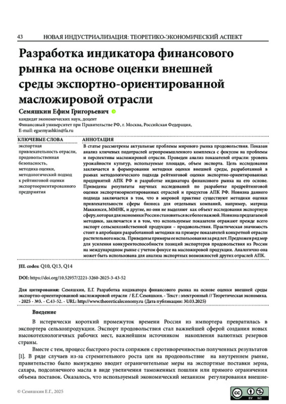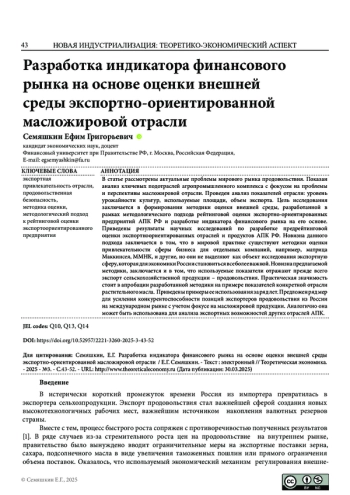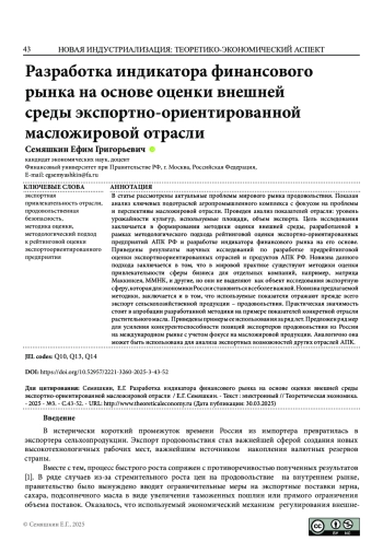 Цель работы заключается в формировании методики оценки внешней среды, разработанной в рамках методологического подхода рейтинговой оценки экспортно-ориентированных предприятий АПК РФ и разработке индикатора финансового рынка на его основе. Новизна данного подхода заключается в том, что в мировой практике существуют методики оценки привлекательности сферы бизнеса для отдельных компаний, например, матрица Маккинсея, ММНК, и другие, но они не выделяют как объект исследования экспортную сферу, которая для экономики России становиться все более важной. Новизна предлагаемой методики, заключается и в том что используемые показатели отражают прежде всего экспорт сельскохозяйственной продукции - продовольствия. Практическая значимость стоит в апробации разработанной методики на примере показателей конкретной отрасли растительного масла. Аналогично она может быть использована для анализа экспортных возможностей других отраслей АПК.