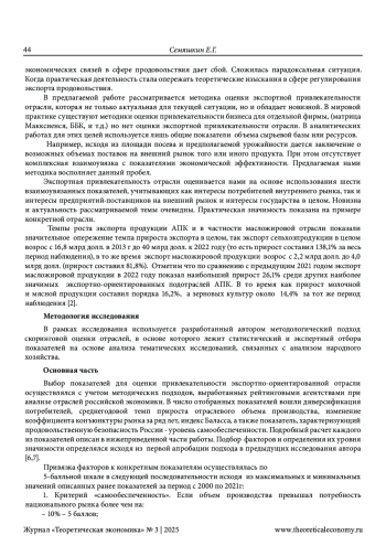 11. Семяшкин Е. Г. (2023) Диссертация на соискание ученой степени кандидата экономических наук “Формирование системы кредитных рейтингов экспортно-ориентированных предприятий агропромышленного комплекса” ФГАОУ ВО “Московский государственный институт международных отношений (университет)”. С.112-121. Семяшкин Г.М., Семяшкин Е. Г. “Влияние экспорта на общую доходность отраслей в АПК РК”. Журнал “Экономика и предпринимательство” № 10, 2023 г.