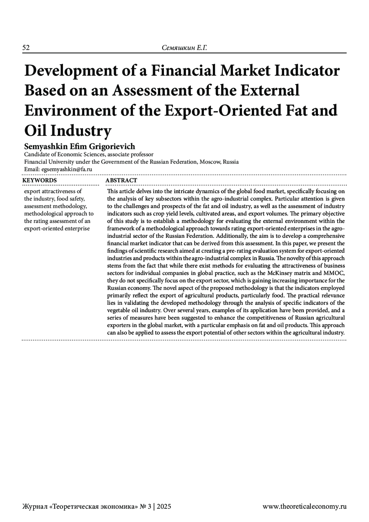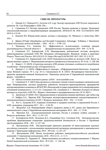 7. Семяшкин Е.Г., Карминский А.М. (2023) Конкурентоспособность экспорта АПК. Фокус на дружественные страны // Национальные интересы: приоритеты и безопасность. № 19 (4). С. 228-246. EDN: VAMTXS