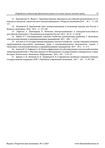 25. Алтухов А. И. Государственная поддержка сельского хозяйства - основа совершенствования территориально-отраслевого разделения труда в агропромышленном производстве страны //Экономика сельскохозяйственных и перерабатывающих предприятий. 2017. -№11. -С. 2-9. EDN: ZWNIZB
