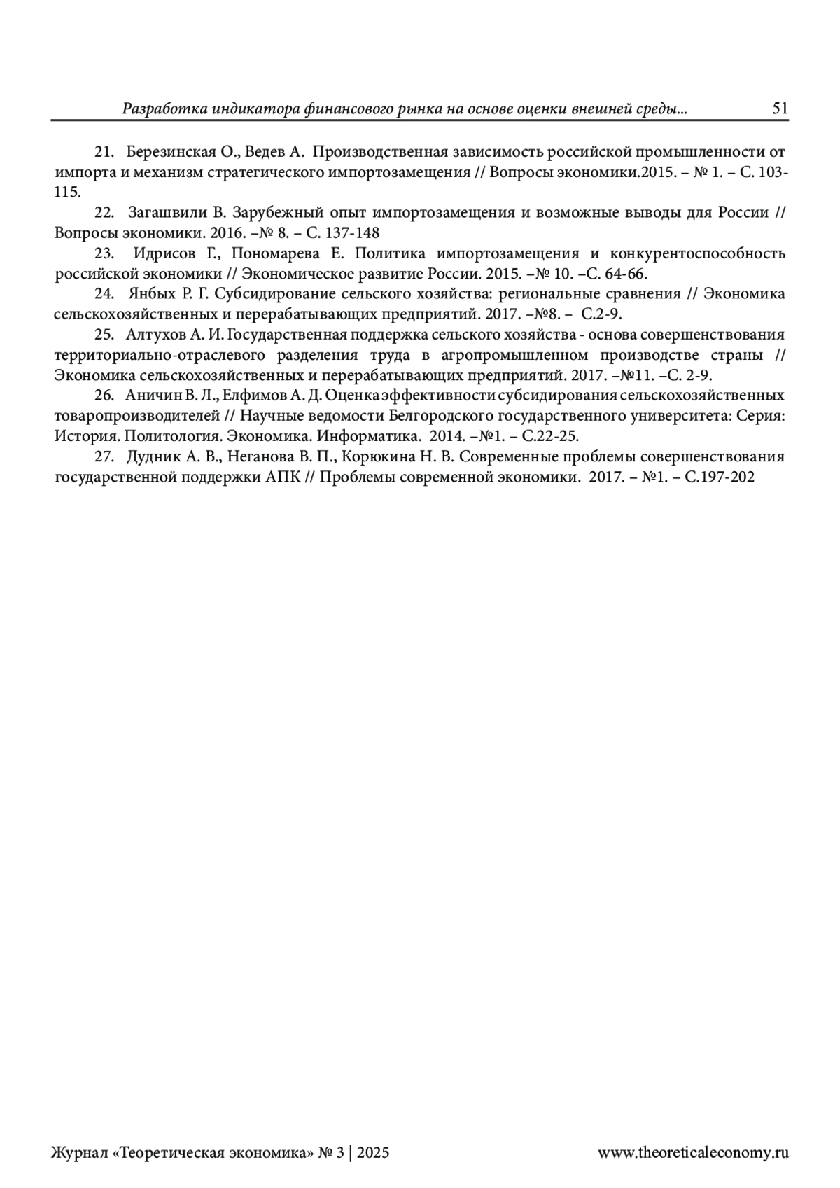 21. Березинская О., Ведев А. Производственная зависимость российской промышленности от импорта и механизм стратегического импортозамещения // Вопросы экономики.2015. - № 1. - С. 103-115. EDN: THNABJ