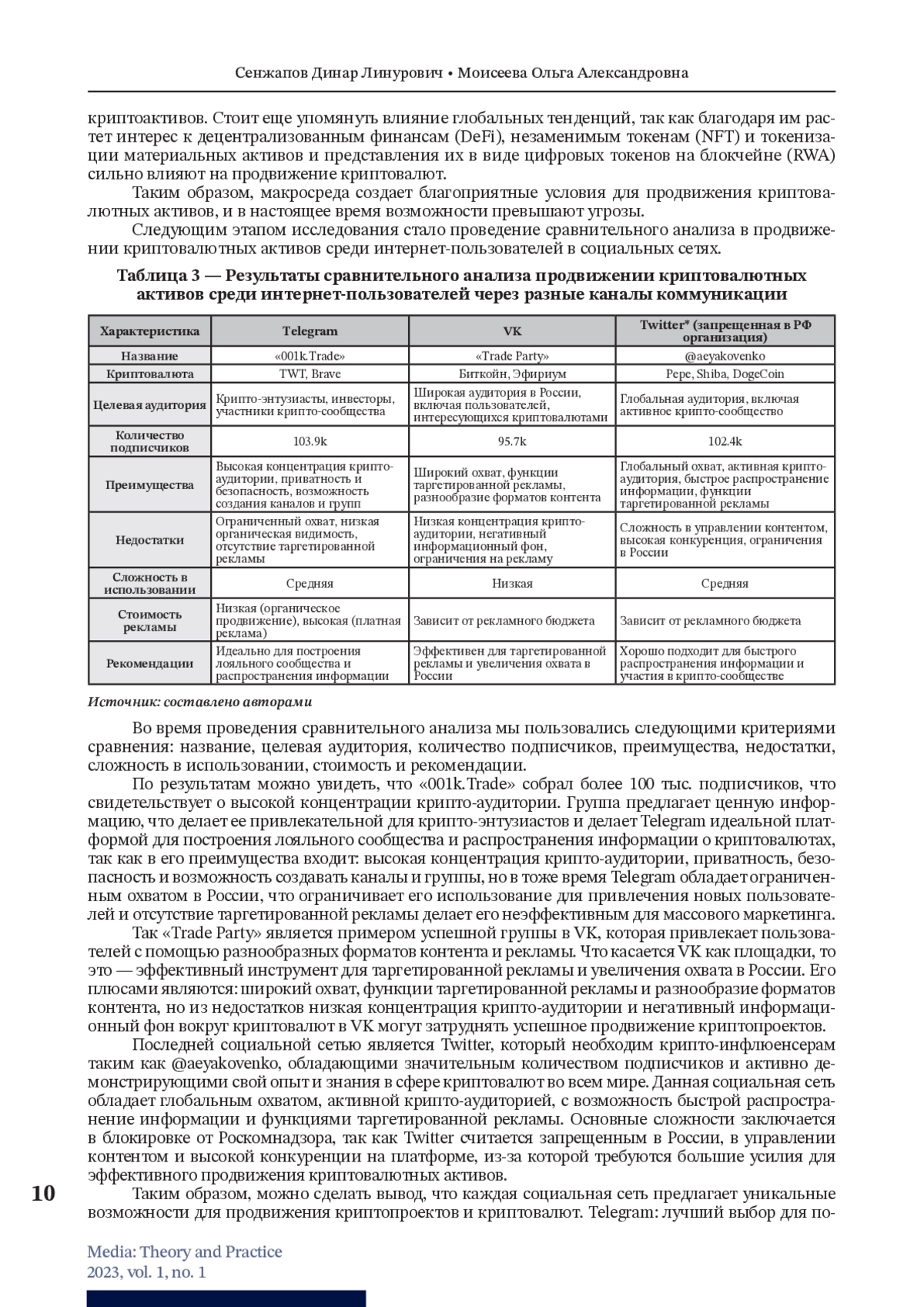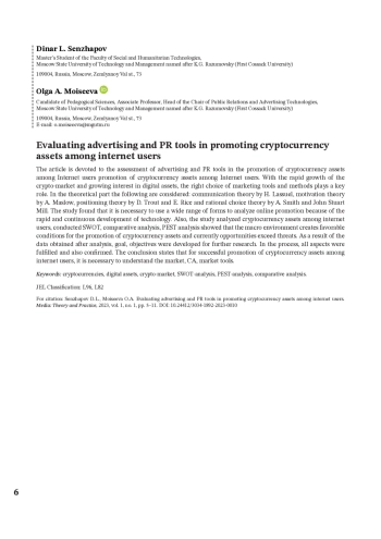 Статья посвящена оценке рекламных и пиар-инструментов в продвижении криптовалютных активов среди интернет-пользователей продвижения криптовалютных активов среди интернет-пользователей. В условиях стремительного роста крипторынка и растущего интереса к цифровым активам, ключевую роль играет правильный выбор маркетинговых инструментов и методов. В теоретической части рассматриваются: теория коммуникации по Х. Лассуэлу, мотивации по А. Маслоу, теория позиционирования по Д. Трауту и Э. Райсу и теория разумного выбора А. Смита и Джона Стюарта Милля. В ходе исследования было выявлено, что необходимо использовать широкий спектр форм анализа продвижения в интернете из-за быстрого и непрерывного развития технологий. Также в исследовании было проанализировано криптовалютных активов среди интернет-пользователей, проведены SWOT, сравнительный анализ, PEST-анализ показал, что макросреда создает благоприятные условия для продвижения криптовалютных активов, и в настоящее время возможности превышают угрозы. В результате данных, полученных после анализа, были разработаны цель, задачи для дальнейшего исследования. В процессе работы все аспекты были выполнены, а также подтверждены. В заключении говорится о том, что для успешного продвижения криптовалютных активов среди интернет-пользователей нужно понимать рынок, цифровые активы, инструменты рынка.