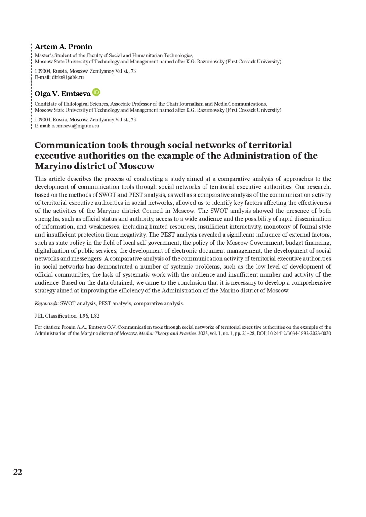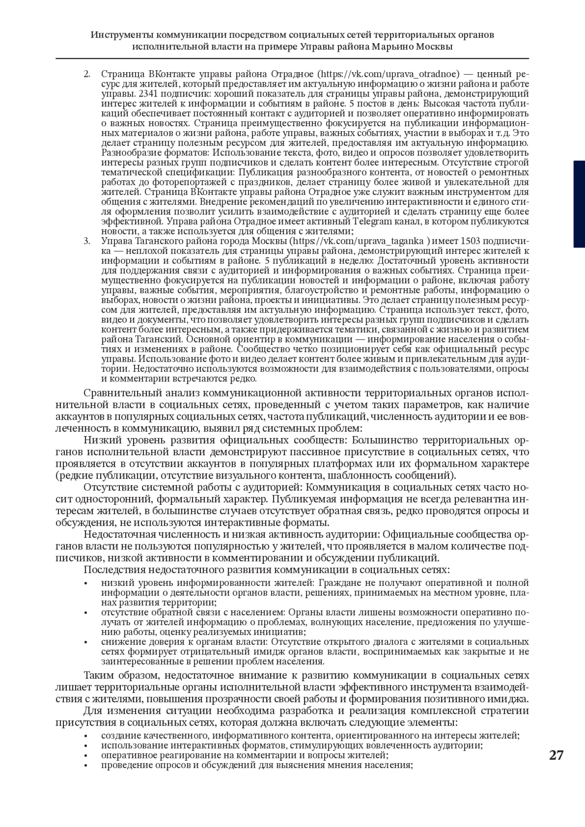 В данной статье описан процесс проведения исследования, направленного на сравнительный анализ подходов к разработке инструментов коммуникации посредством социальных сетей территориальных органов исполнительной власти. Проведенное нами исследование, основанное на методах SWOT- и PEST-анализа, а также сравнительном анализе коммуникационной активности территориальных органов исполнительной власти в социальных сетях, позволило выявить ключевые факторы, влияющие на эффективность деятельности Управы района Марьино г. Москва. SWOT-анализ показал наличие как сильных сторон, таких как официальный статус и авторитет, доступ к широкой аудитории и возможность оперативного распространения информации, так и слабых сторон, включающих ограниченность ресурсов, недостаточную интерактивность, однообразие формального стиля и недостаточную защиту от негатива. PEST-анализ выявил значимое влияние внешних факторов, таких как государственная политика в сфере местного самоуправления, политика Правительства Москвы, бюджетное финансирование, цифровизация государственных услуг, развитие электронного документооборота, развитие социальных сетей и мессенджеров. Сравнительный анализ коммуникационной активности территориальных органов исполнительной власти в социальных сетях продемонстрировал ряд системных проблем, таких как низкий уровень развития официальных сообществ, отсутствие системной работы с аудиторией и недостаточная численность и активность аудитории. На основании полученных данных мы пришли к выводу о необходимости разработки комплексной стратегии, направленной на повышение эффективности работы Управы района Марьино г. Москва.