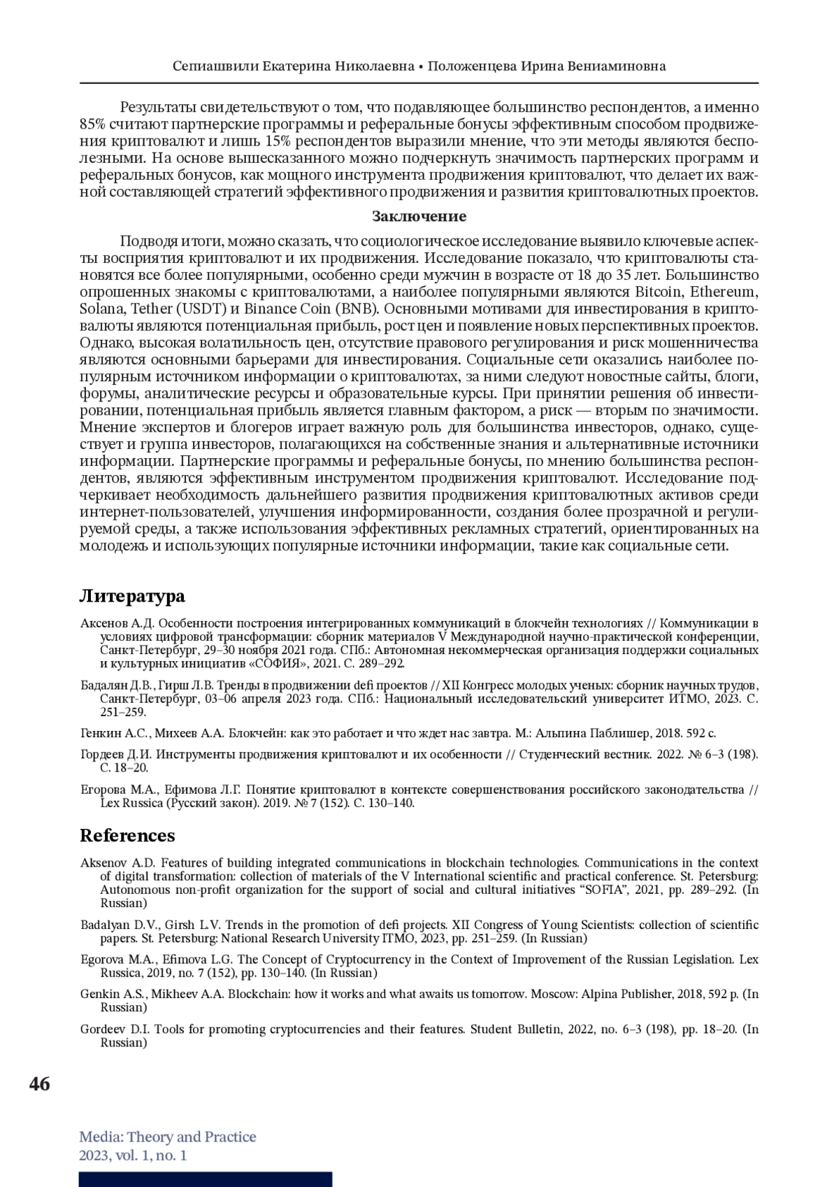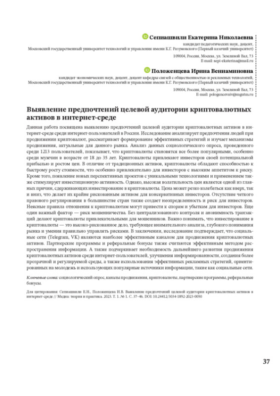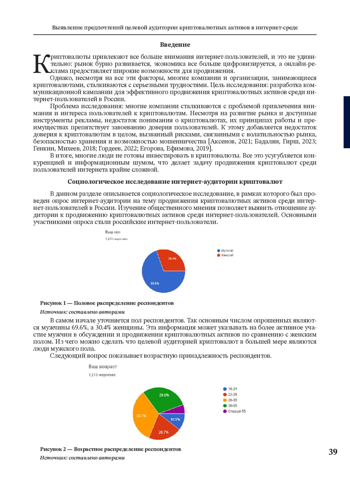 Данная работа посвящена выявлению предпочтений целевой аудитории криптовалютных активов в интернет-среде среди интернет-пользователей в России. Исследование анализирует предпочтения людей при продвижении криптовалют, рассматривает формирование эффективных стратегий и изучает механизмы продвижения, актуальные для данного рынка. Анализ данных социологического опроса, проведенного среди 1213 пользователей, показывает, что криптовалюты становятся все более популярными, особенно среди мужчин в возрасте от 18 до 35 лет. Криптовалюты привлекают инвесторов своей потенциальной прибылью и ростом цен. В отличие от традиционных активов, криптовалюты обладают способностью к быстрому росту стоимости, что особенно привлекательно для инвесторов с высоким аппетитом к риску. Кроме того, появление новых перспективных проектов с уникальными технологиями и применением также стимулирует инвестиционную активность. Однако, высокая волатильность цен является одной из главных причин, сдерживающих инвестирование в криптовалюты. Цена может резко колебаться как вверх, так и вниз, что делает их крайне рискованным активом для консервативных инвесторов. Отсутствие четкого правового регулирования в большинстве стран также создает неопределенность и риск для инвесторов. Неясные правила отношения к криптовалютам могут привести к спорам и убыткам для инвесторов. Еще один важный фактор — риск мошенничества. Без централизованного контроля и анонимность транзакций делают криптовалюты привлекательными для мошенников. Важно понимать, что инвестирование в криптовалюты — это высоко-рискованное дело, требующее внимательного анализа, глубокого понимания рынка и умения правильно управлять рисками. В заключении, исследование подтверждает, что социальные сети (Telegram, VK) являются наиболее эффективным каналом для продвижения криптовалютных активов. Партнерские программы и реферальные бонусы также считаются эффективным методом распространения информации. А также подчеркивает необходимость дальнейшего развития продвижения криптовалютных активов среди интернет-пользователей, улучшения информированности, создания более прозрачной и регулируемой среды, а также использования эффективных рекламных стратегий, ориентированных на молодежь и использующих популярные источники информации, такие как социальные сети.