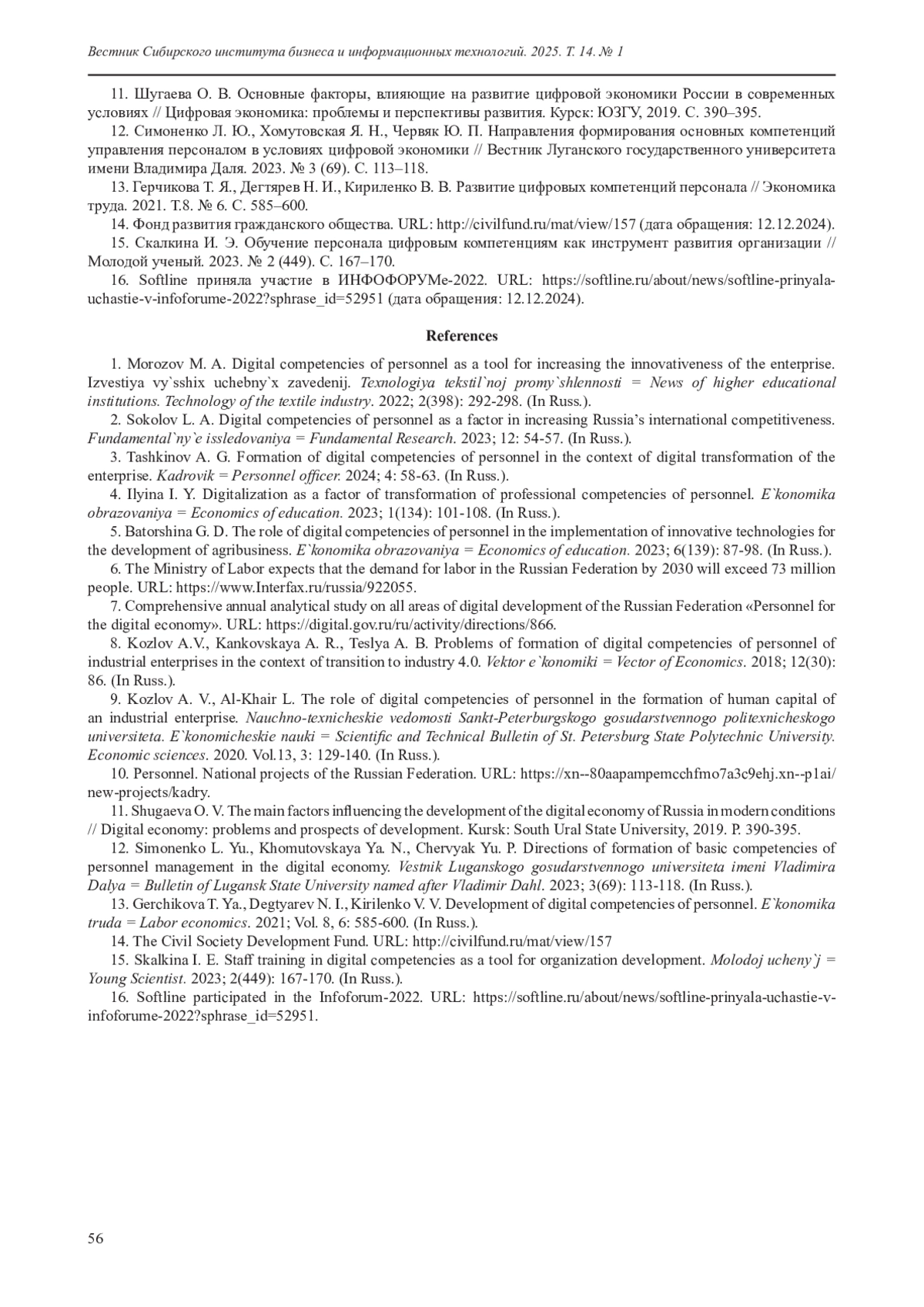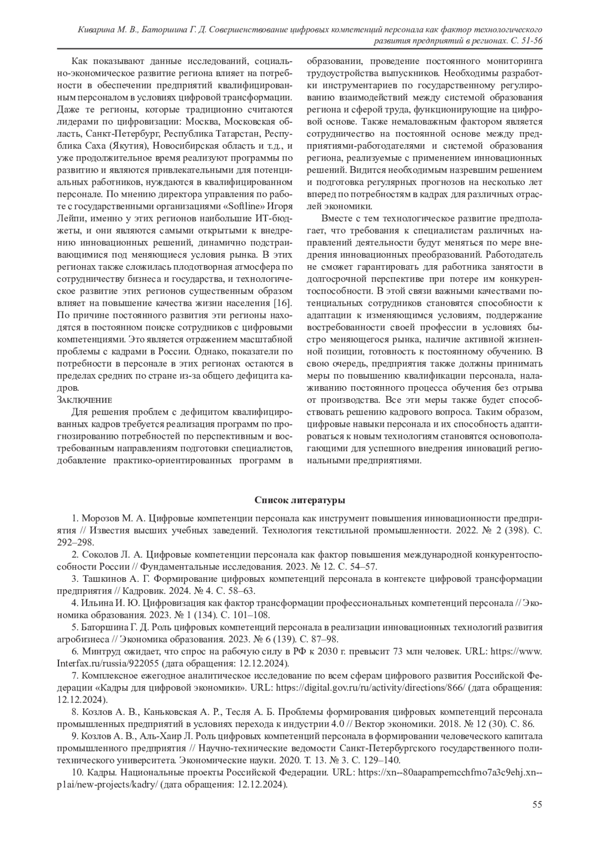 КИВАРИНА М. В., БАТОРШИНА Г. Д. СОВЕРШЕНСТВОВАНИЕ ЦИФРОВЫХ КОМПЕТЕНЦИЙ ПЕРСОНАЛА КАК ФАКТОР ТЕХНОЛОГИЧЕСКОГО РАЗВИТИЯ ПРЕДПРИЯТИЙ В РЕГИОНАХ // ВЕСТНИК СИБИРСКОГО ИНСТИТУТА БИЗНЕСА И ИНФОРМАЦИОННЫХ ТЕХНОЛОГИЙ. 2025. ТОМ 14, № 1