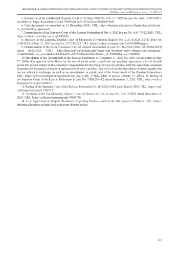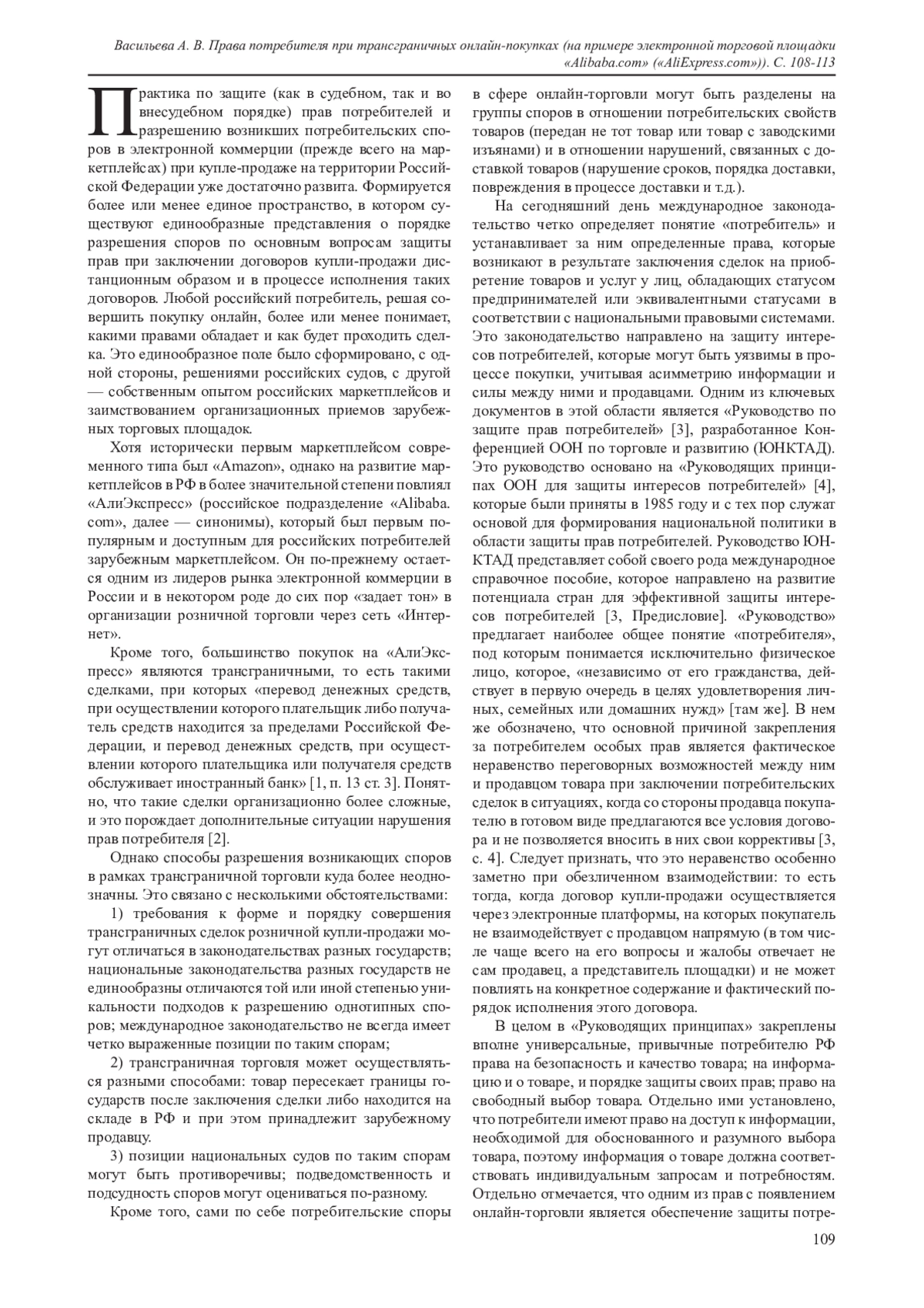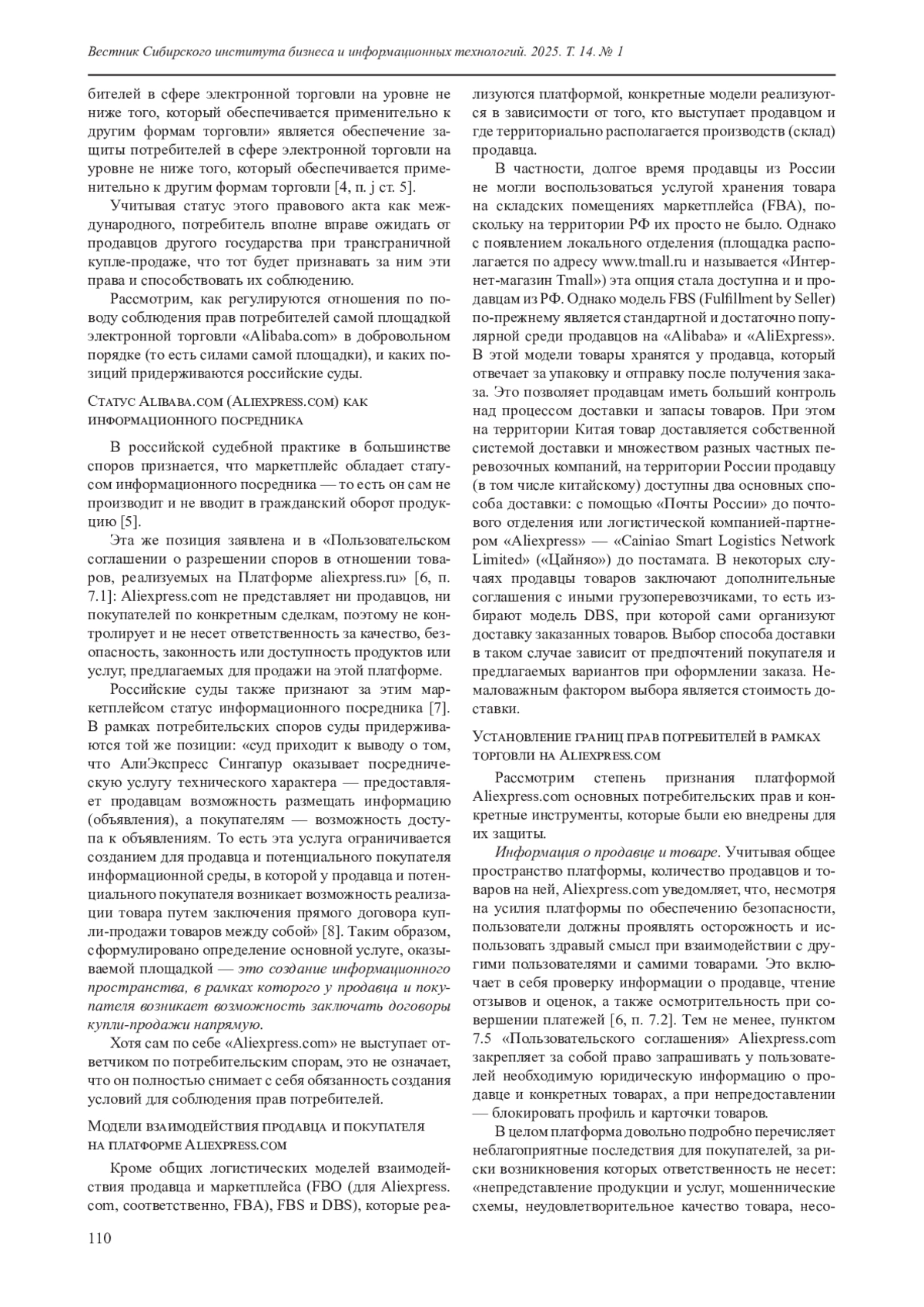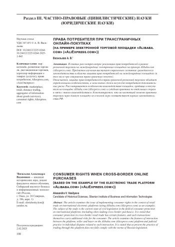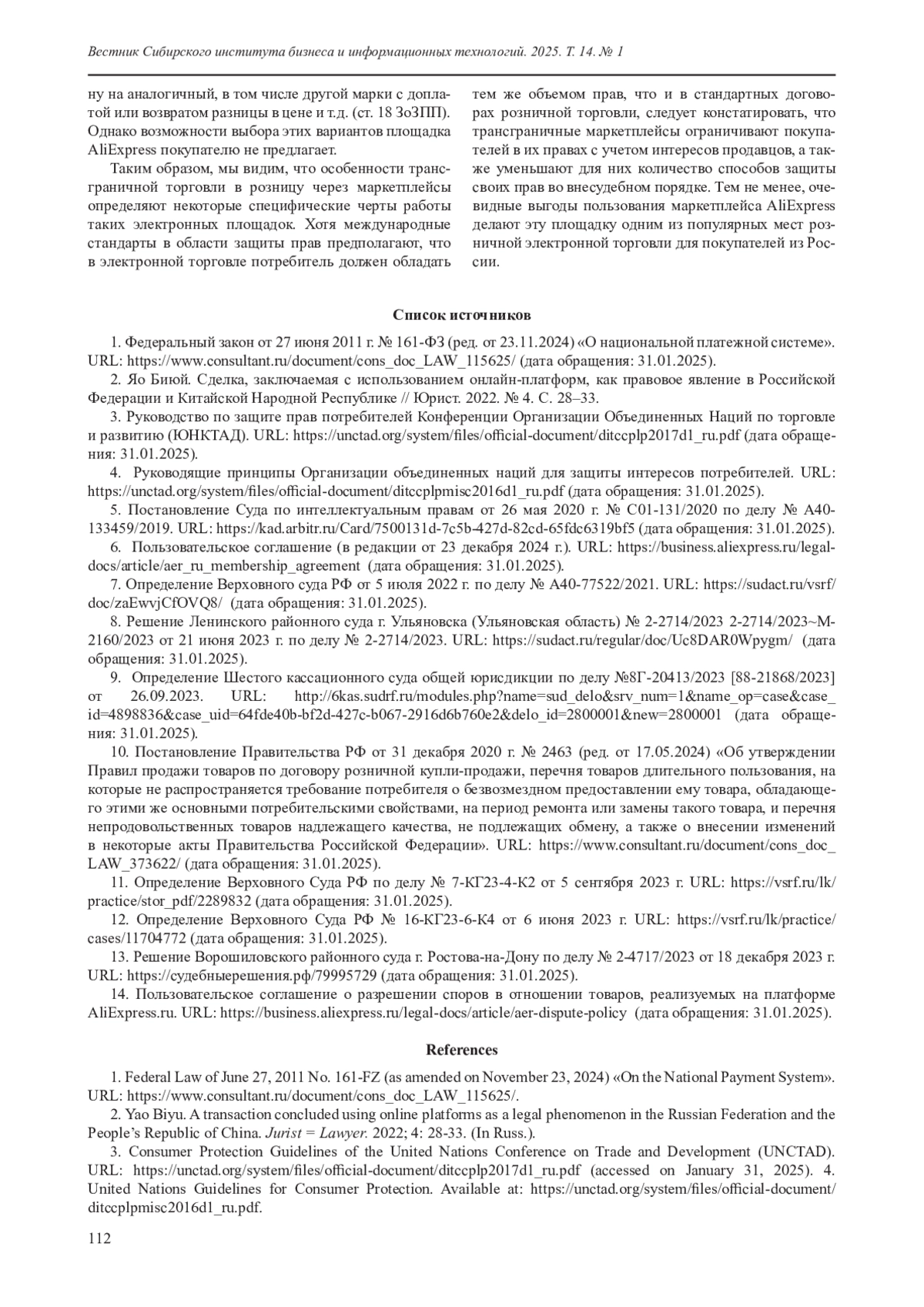 ВАСИЛЬЕВА А. В. ПРАВА ПОТРЕБИТЕЛЯ ПРИ ТРАНСГРАНИЧНЫХ ОНЛАЙН-ПОКУПКАХ (НА ПРИМЕРЕ ЭЛЕКТРОННОЙ ТОРГОВОЙ ПЛОЩАДКИ «ALIBABA. COM» («ALIEXPRESS. COM»)) // ВЕСТНИК СИБИРСКОГО ИНСТИТУТА БИЗНЕСА И ИНФОРМАЦИОННЫХ ТЕХНОЛОГИЙ. 2025. ТОМ 14, № 1