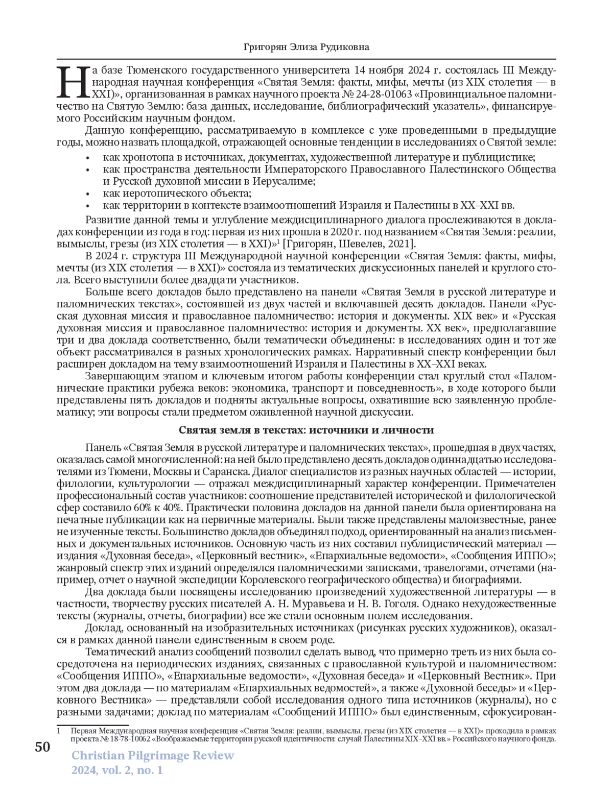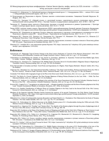 Целью статьи является обзор докладов, выводов и вопросов III Международной научной конференции «Святая Земля: факты, мифы, мечты (из ХІХ столетия — в ХХІ)», состоявшейся на базе Тюменского государственного университета 14 ноября 2024 г. и организованной в рамках научного проекта № 24-28-01063 «Провинциальное паломничество на Святую Землю: база данных, исследование, библиографический указатель», финансируемого Российским научным фондом. Данная конференция, ставшая третьей по счету в 2024 г., продолжила традицию междисциплинарного изучения Святой земли. С 2020 г., выступая в качестве научной площадки, аккумулировала ключевые направления современных исследований о Святой земле в разных аспектах. Святая земля как хронотоп в литературе и документах, как пространство деятельности Русской духовной миссии и ИППО, как объект иеротопии и как территория современных израильско-палестинских отношений. В рамках конференции выступили более двадцати участников из России, Беларуси и США. Были представлены исследования в области истории, филологии, культурологии, политологии, иеротопии, иудаики и израилеведения, которые взаимодополняли друг друга, способствовали комплексному осмыслению темы Святой земли в религиозной, культурной и исторической перспективах и расширили методологические горизонты изучения. Наиболее масштабной стала дискуссионная панель «Святая Земля в русской литературе и паломнических текстах», в докладах которой подчеркивалась важность культурно-исторического подхода. Панель «Иерусалим в истории и культуре: образы, символы и художественные интерпретации», в отличие от первой, сосредоточенной на русских паломниках и источниках, делала акцент на международных, кросскультурных и исторических трансформациях Иерусалима. Она объединила доклады по теме истории символа в мировой культуре с использованием различных научных подходов. Также были представлены две дискуссионные площадки об истории и личностях Русской духовной миссии в период с XIX по XX вв. В заключение конференции был проведен круглый стол «Паломнические практики рубежа веков: экономика, транспорт и повседневность», на котором участниками были актуализированы такие вопросы, как портретирование паломника; сохранность документов в регионах; тенденции изменения паломничества, связанные с развитием социокультурных и экономических условий; роль транспорта в изменении традиционных представлений о паломничестве. Конференция подтвердила устойчивую тенденцию к углублению междисциплинарного диалога и расширению нарративного спектра в изучении Святой земли.