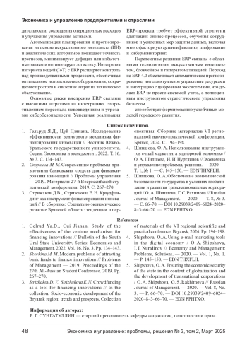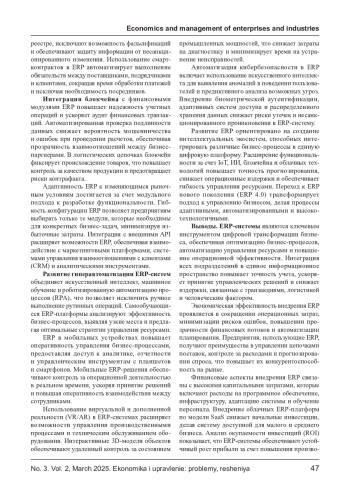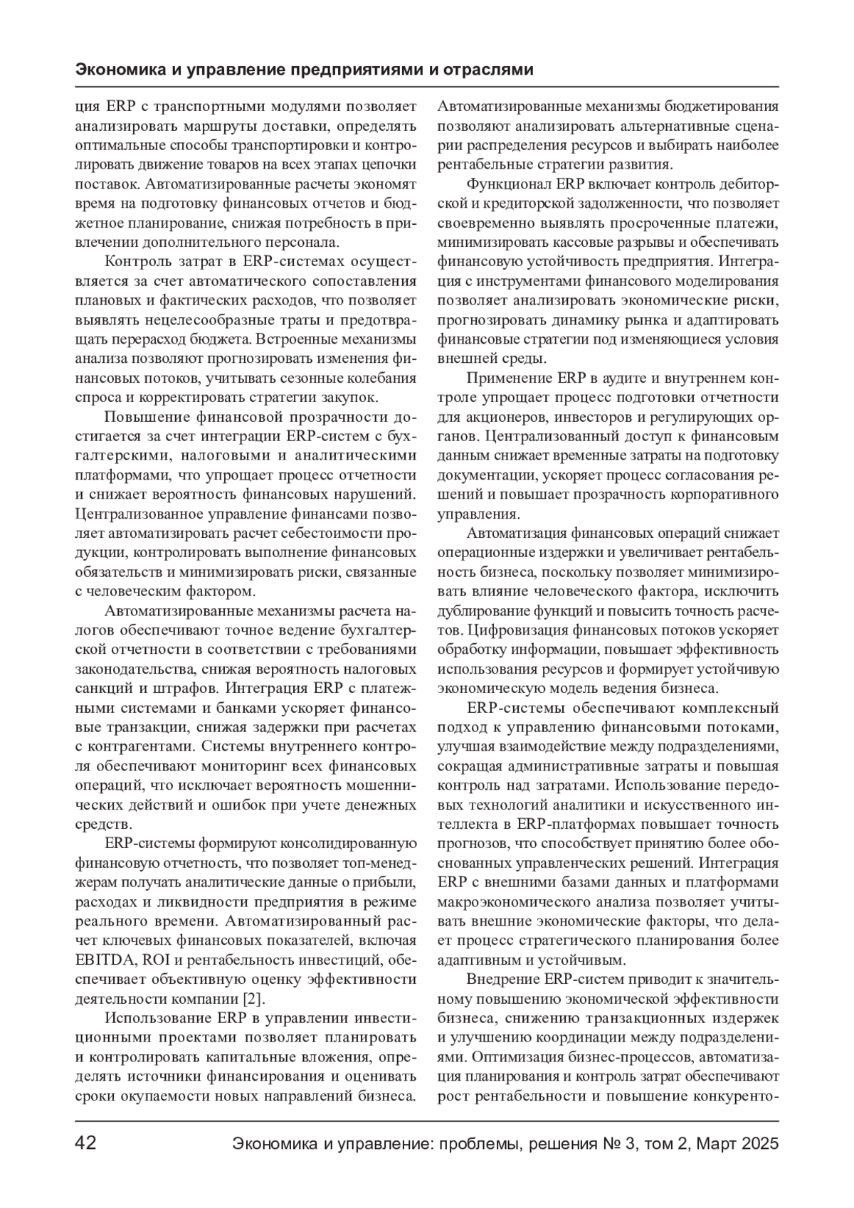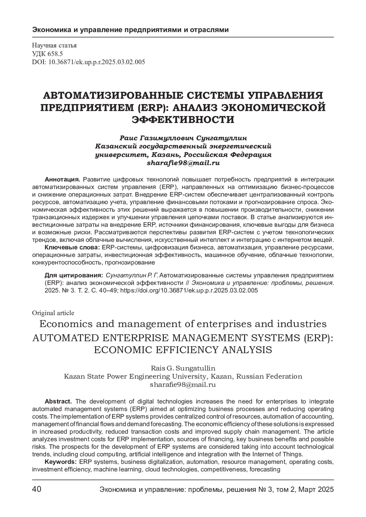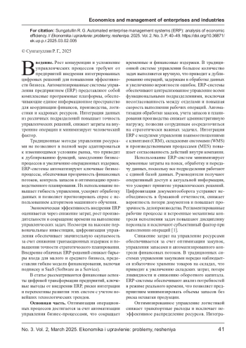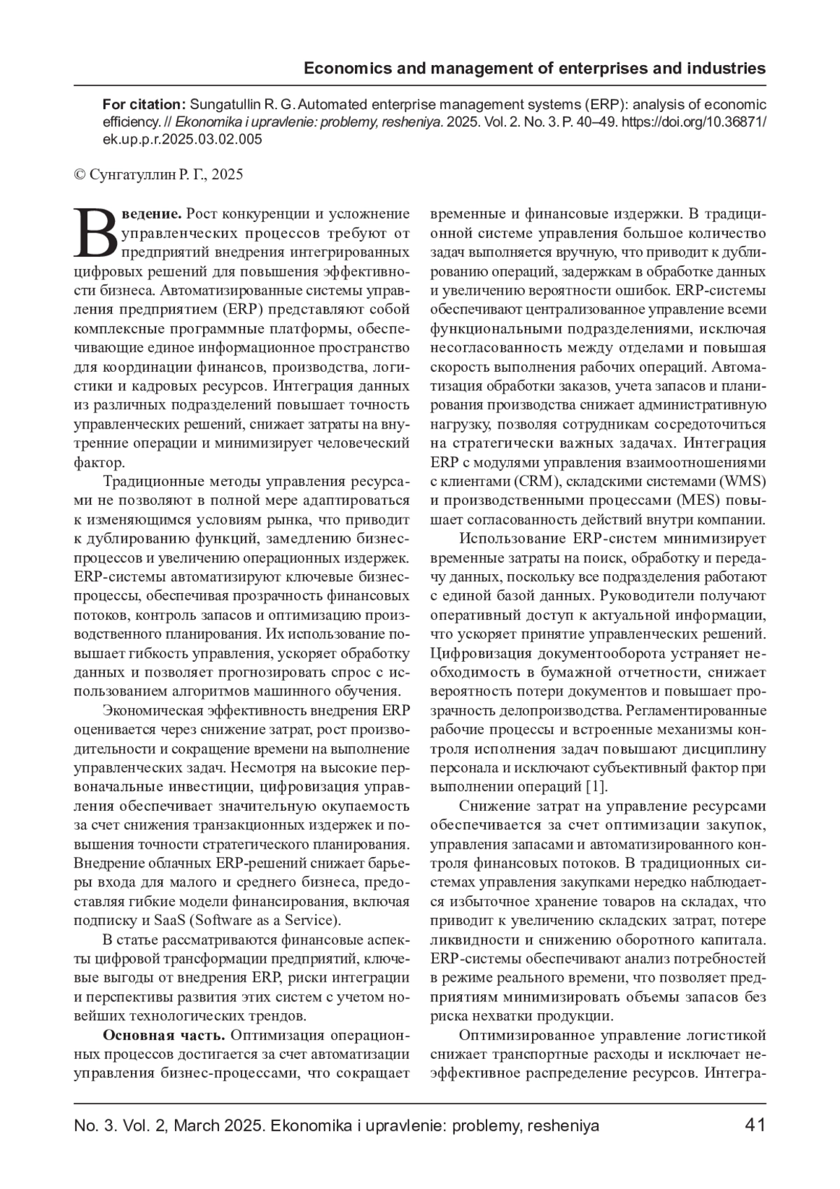 СУНГАТУЛЛИН Р. Г. АВТОМАТИЗИРОВАННЫЕ СИСТЕМЫ УПРАВЛЕНИЯ ПРЕДПРИЯТИЕМ (ERP): АНАЛИЗ ЭКОНОМИЧЕСКОЙ ЭФФЕКТИВНОСТИ // ЭКОНОМИКА И УПРАВЛЕНИЕ: ПРОБЛЕМЫ, РЕШЕНИЯ. 2025. ТОМ 2 № 3