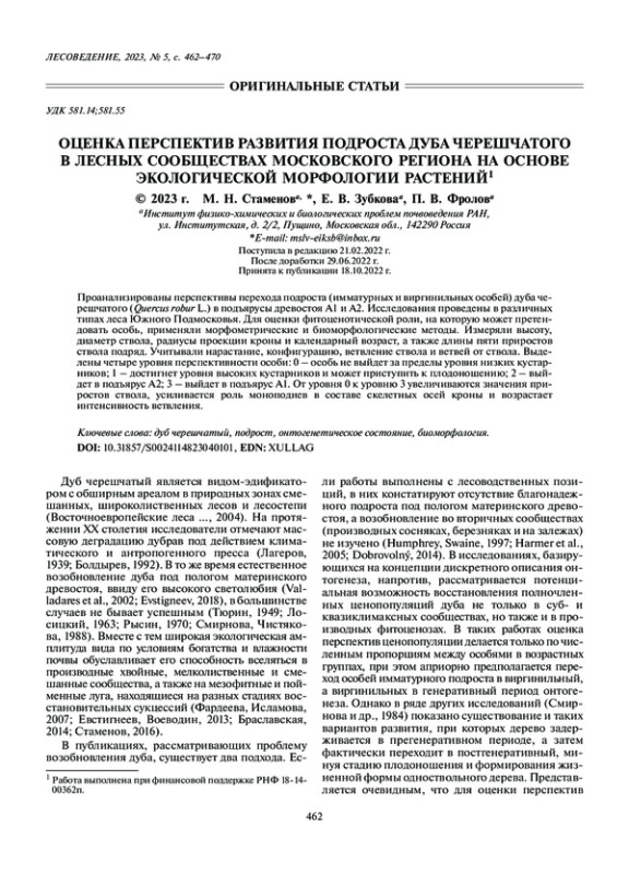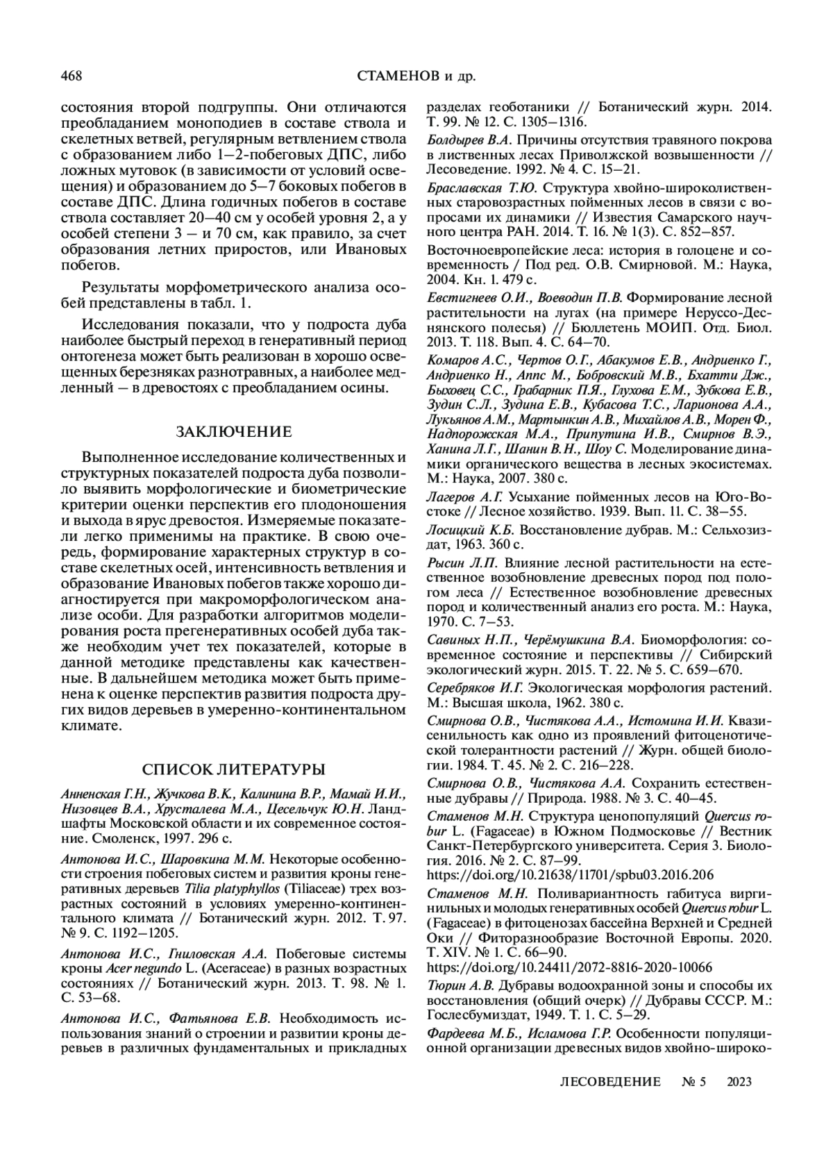 18. Стаменов М.Н. Поливариантность габитуса виргинильных и молодых генеративных особей Quercus robur L. (Fagaceae) в фитоценозах бассейна Верхней и Средней Оки // Фиторазнообразие Восточной Европы. 2020. Т. XIV. № 1. С. 66–90. DOI: 10.24411/2072-8816-2020-10066 EDN: MFXSFC