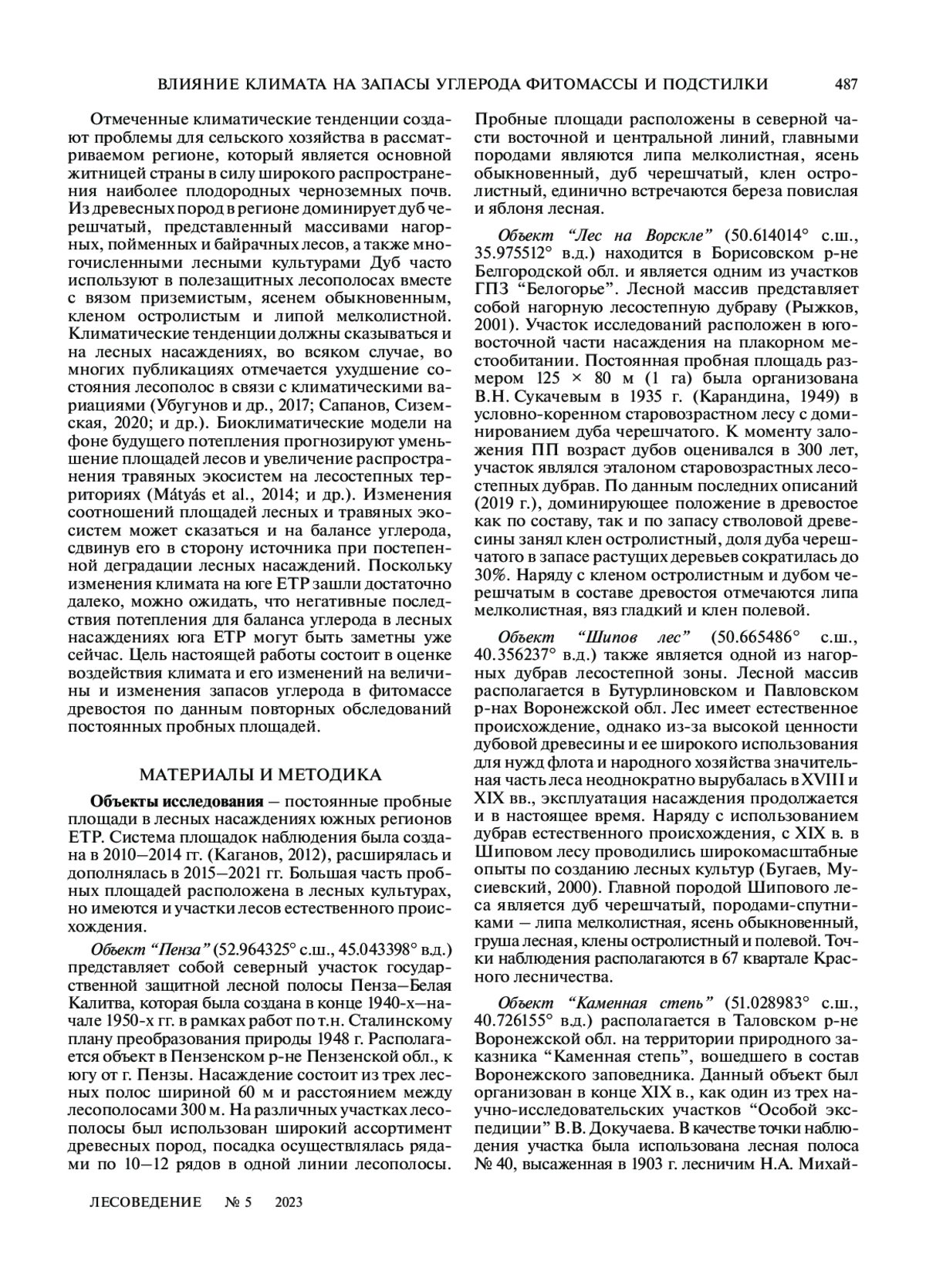 Современное глобальное изменение климата все более усиливает свои проявления, воздействуя на антропогенные и природные системы. Биоклиматические модели прогнозируют значительные сдвиги границ биомов, в том числе сокращение доли лесов на лесостепных территориях. Этот процесс может сказаться и на запасах углерода. Цель работы состояла в оценке воздействия климата и его изменений на величины и изменения запасов углерода в фитомассе древостоя по данным повторных обследований постоянных пробных площадей. В южных областях Европейской территории России было выбрано 8 лесных объектов, в которых устроены пробные площади. На пробных площадях проведены повторные обследования в 2010–2011, 2014–2015, 2019–2020 гг. Запасы углерода живой и сухостойной части древостоя оценены методом расчета по таксационным характеристикам. Запасы углерода подстилки определены весовым методом. Проведен анализ метеорологической информации по метеостанциям, наиболее близким к объектам исследования. Среднегодовая температура за 1991–2020 гг. возросла по сравнению с 1961–1990 гг. на 1.13°С, что в 2.5 раза больше, чем в среднем по планете. Годовые суммы осадков при этом уменьшились с 448.2 мм до 445.4 мм. Среднее значение гидротермического коэффициента Г. Т. Селянинова за май–сентябрь в 1961–1990 гг. составляло 0.85, а в 1991–2020 гг. 0.79. Запас углерода фитомассы древостоя в исследованных лесных насаждениях варьировал от 38.5 ± 7.4 т С га–1 до 270.6 ± 52.8 т С га–1. При повторных обследованиях были выявлены как увеличения, так и уменьшения запасов углерода фитомассы, составлявшие за пятилетний интервал от –23.8 до 31.9 т С га –1. Сравнение запасов углерода фитомассы с климатическими характеристиками выявило статистически достоверную связь с ГТК за май–сентябрь. Однако сравнение изменений фитомассы с изменениями среднегодовой температуры, годовых осадков и ГТК за май-сентябрь не выявило значимых зависимостей. Отсутствие значимых связей изменений углерода фитомассы с изменениями климатических параметров может определяться устойчивостью лесных экосистем, обеспечивающей сохранение их функций на временных интервалах в несколько лет