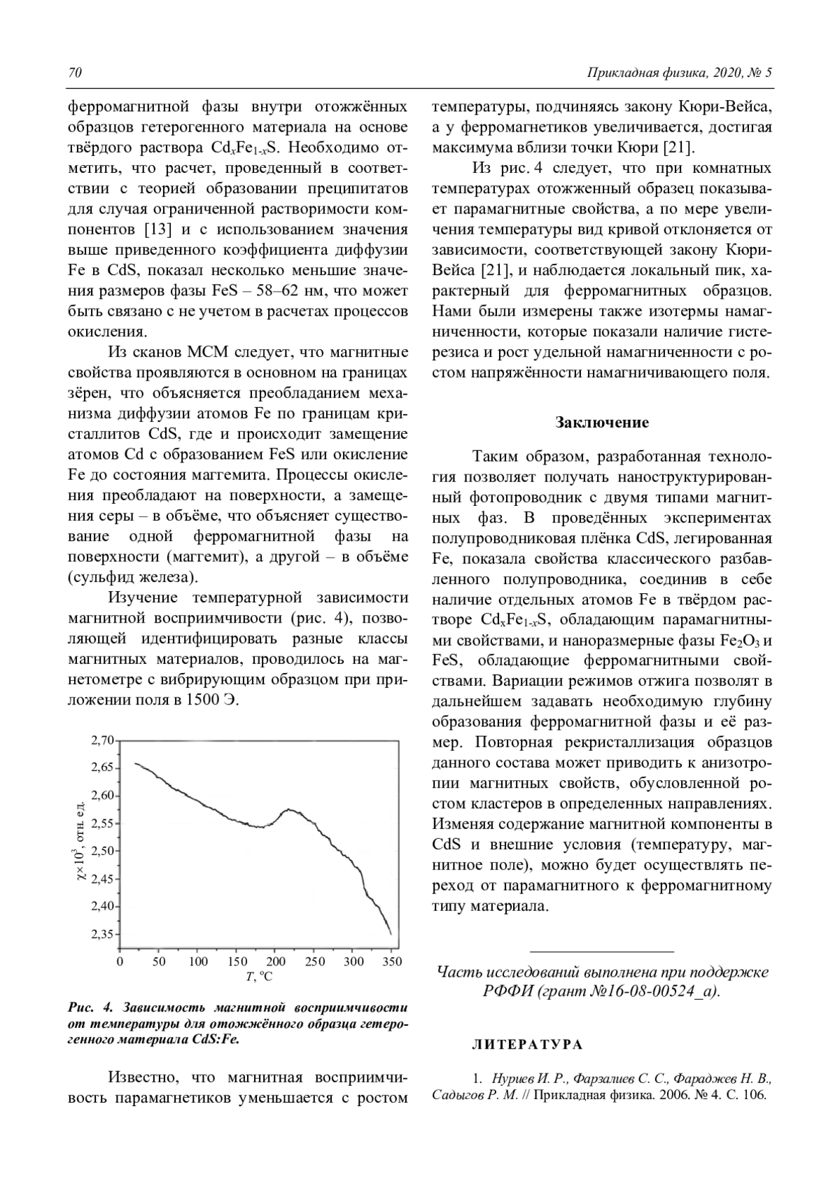 Таким образом, разработанная технология позволяет получать наноструктурированный фотопроводник с двумя типами магнитных фаз. В проведённых экспериментах полупроводниковая плёнка CdS, легированная Fe, показала свойства классического разбавленного полупроводника, соединив в себе наличие отдельных атомов Fe в твёрдом растворе CdхFe1-xS, обладающим парамагнитными свойствами, и наноразмерные фазы Fe2O3 и FeS, обладающие ферромагнитными свойствами. Вариации режимов отжига позволят в дальнейшем задавать необходимую глубину образования ферромагнитной фазы и её размер. Повторная рекристаллизация образцов данного состава может приводить к анизотропии магнитных свойств, обусловленной ростом кластеров в определенных направлениях. Изменяя содержание магнитной компоненты в CdS и внешние условия (температуру, магнитное поле), можно будет осуществлять переход от парамагнитного к ферромагнитному типу материала.