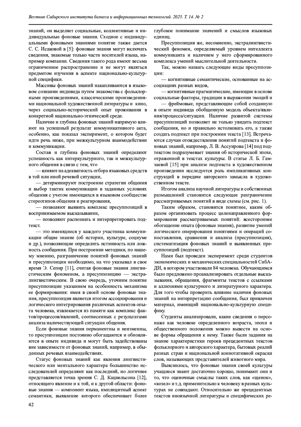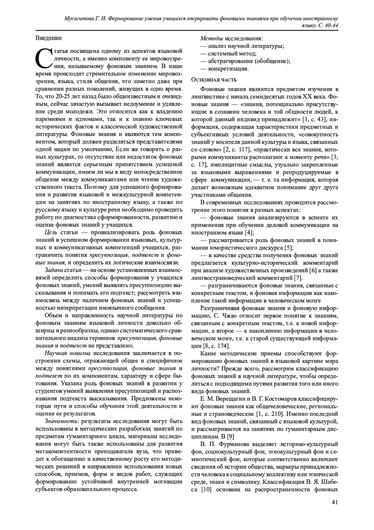 В статье описаны сущность и механизмы формирования фоновых знаний, обозначена роль этих видов знания в формировании умений выявлять пресуппозицию и обнаруживать подтекст высказывания. Цель работы — проанализировать роль фоновых знаний в успешном формировании языковых, культурных и коммуникативных компетенций учащихся, разграничить понятия «пресуппозиция», «подтекст» и «фоновые знания» и определить их логические взаимосвязи. Задачи статьи — на основе установленных между понятиями взаимосвязей определить способы формирования у учащихся фоновых знаний, умений выявлять пресуппозицию высказывания и понимать его подтекст; рассмотреть взаимосвязь между наличием фоновых знаний и успешностью интерпретации иноязычного сообщения. К используемым методам относятся анализ научной литературы, системный метод, абстрагирование, конкретизация. Научная новизна исследования заключается в построении схемы, отражающей общее и специфичное между понятиями «пресуппозиция», «фоновые знания» и «подтекст» по их компонентам, характеру и сфере бытования, а также в указании роли фоновых знаний в формировании умений выявления пресуппозиций и распознавания подтекста высказывания у учащихся. Определены способы обучения студентов выявлению комплекса пресуппозиций и интерпретации подтекста высказывания. Предложены задания для развития этих умений и контроля их сформированности. Полученные результаты могут быть применены при методической подготовке занятий со студентами в рамках курсов «Иностранный язык», «Деловой иностранный язык». Материалы исследования могут быть также использованы для развития метакомпетентности преподавателя вуза, что приведет к обогащению и качественному росту его методических решений в направлении использования новых способов, приемов, форм и видов работ, служащих формированию устойчивой внутренней мотивации субъектов образовательного процесса.