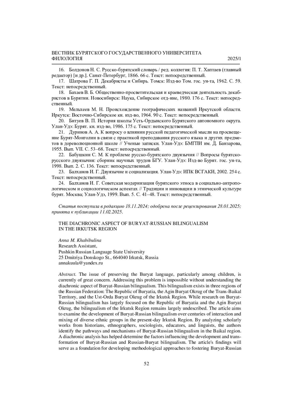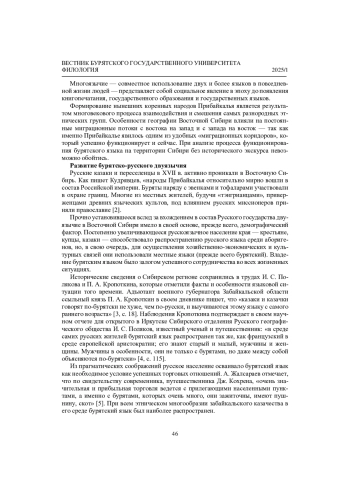 22. Бабушкин С. М. К проблеме русско-бурятского двуязычия // Вопросы бурятскорусского двуязычия: сборник научных трудов БГУ. Улан-Удэ: Изд-во Бурят. гос. ун-та, 1998. Вып. 2. С. 136. Текст: непосредственный.