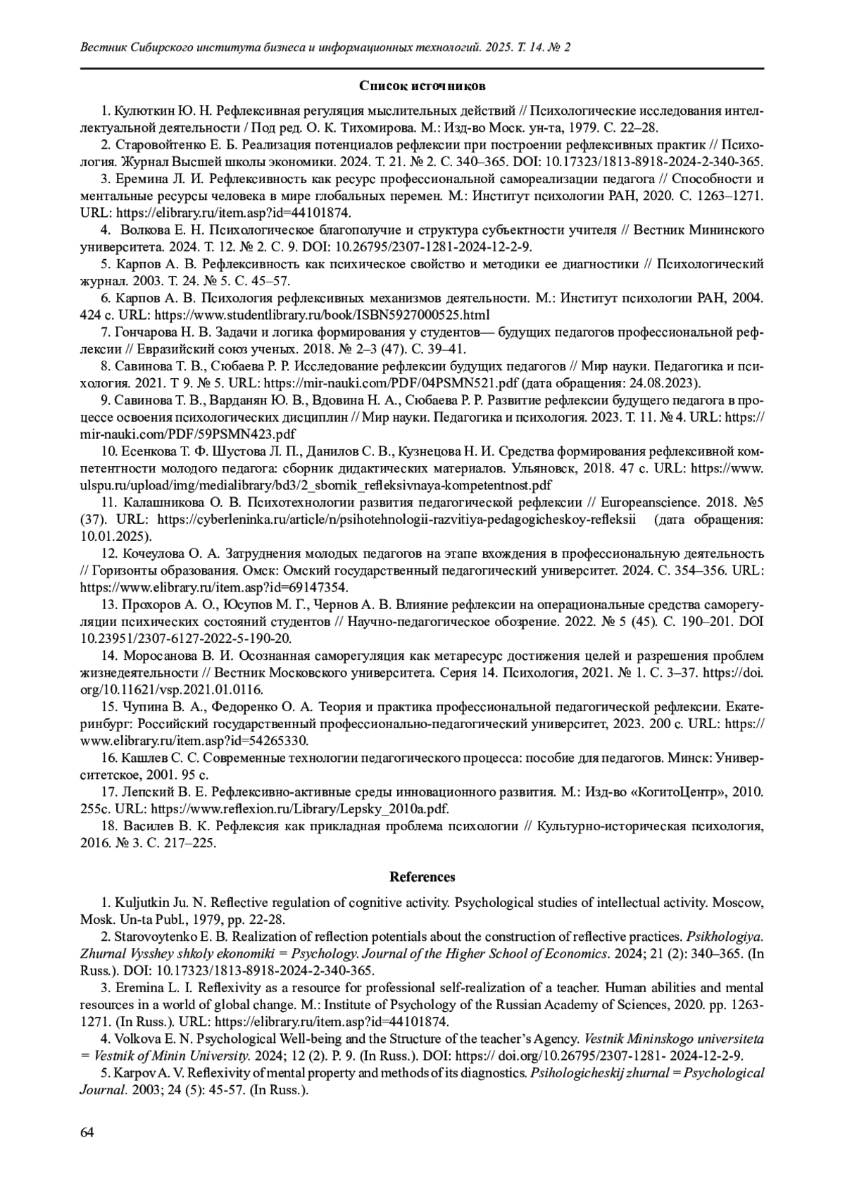 3. Еремина Л. И. Рефлексивность как ресурс профессиональной самореализации педагога // Способности и ментальные ресурсы человека в мире глобальных перемен. М.: Институт психологии РАН, 2020. С. 1263-1271. URL: https://elibrary.ru/item.asp?id=44101874.